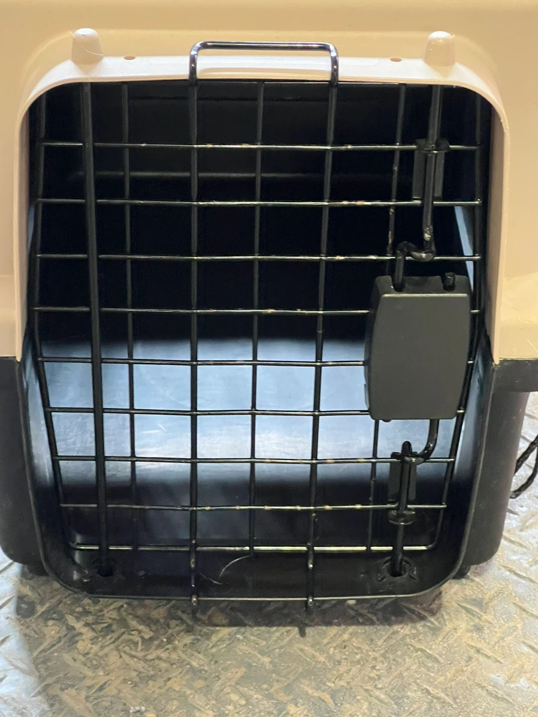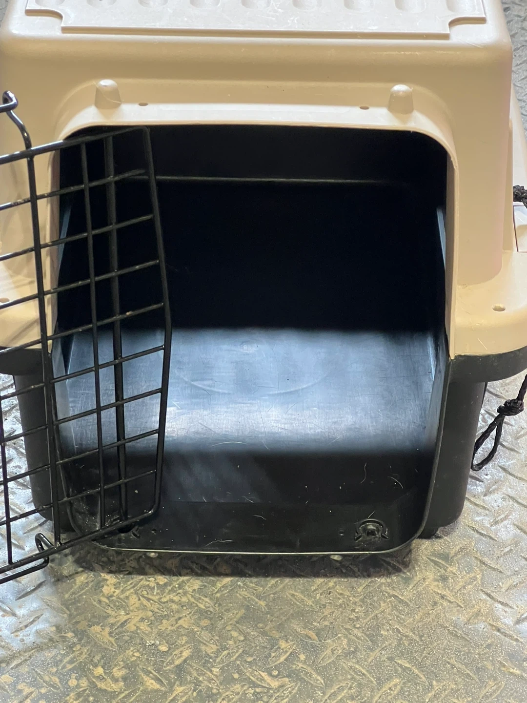 A beige and black plastic pet carrier with a wire door. It's suitable for small to medium pets. This carrier's design allows for good ventilation. It's great for vet visits or travel!