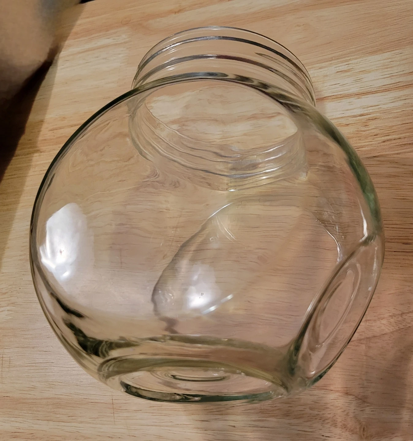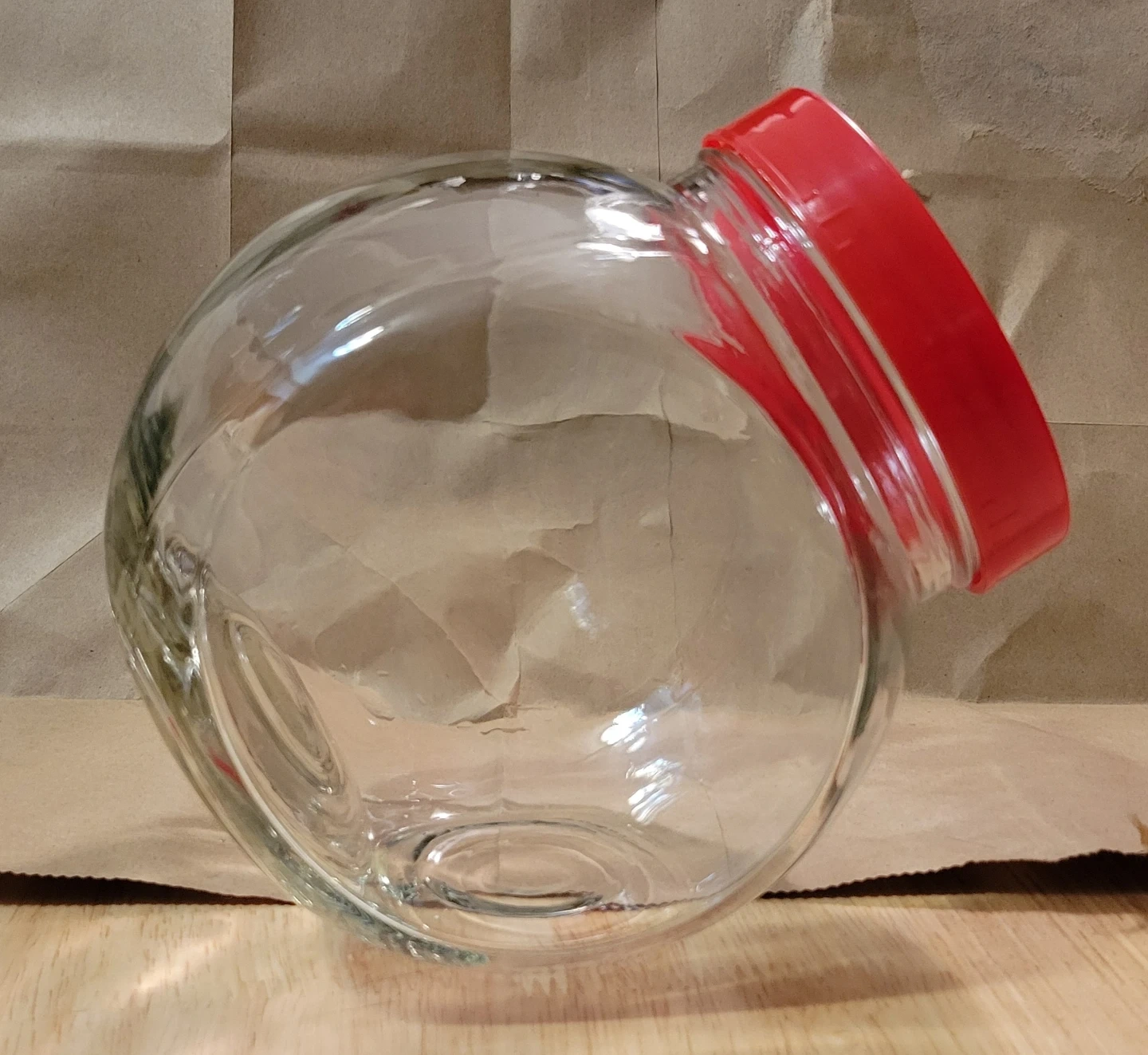 This is a clear glass jar with a red screw-on lid. It's perfect for storing dry goods like candy, cookies, or craft supplies. The jar is made of sturdy glass and has a wide opening for easy access.