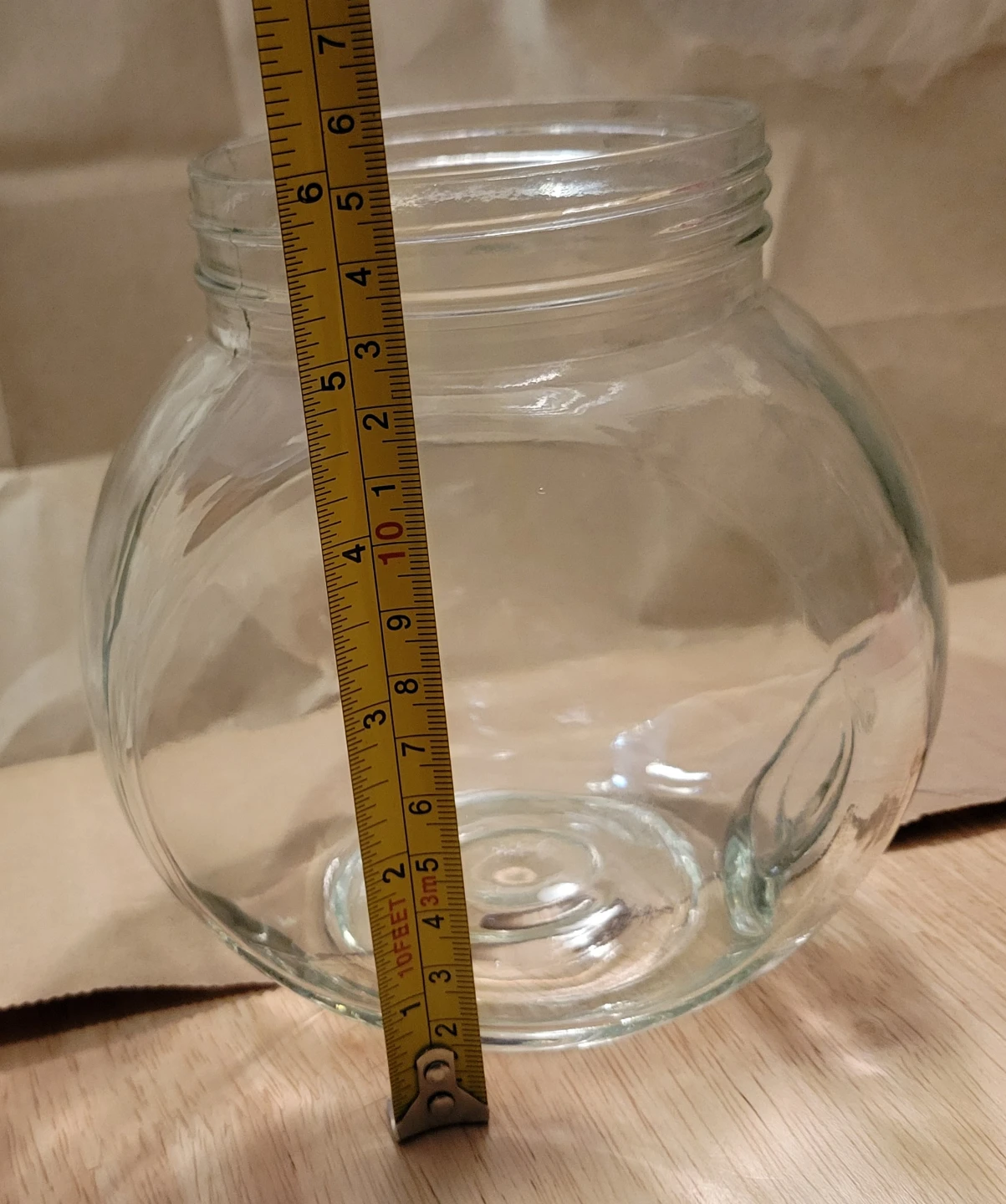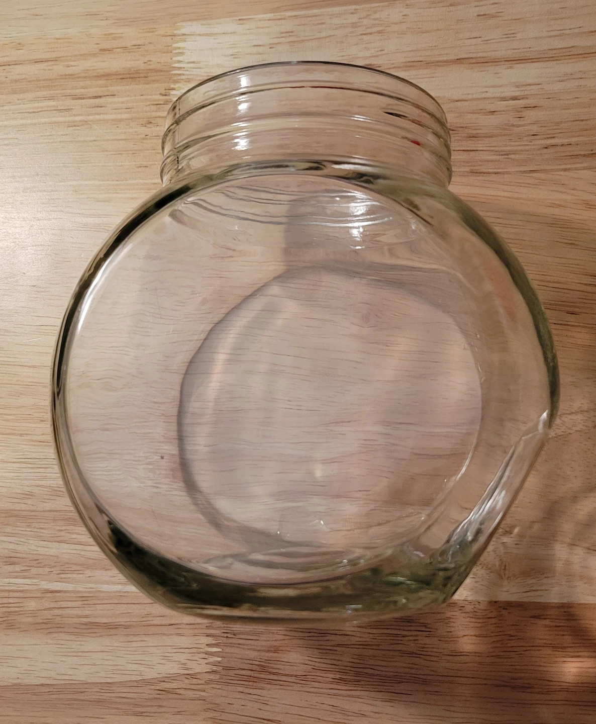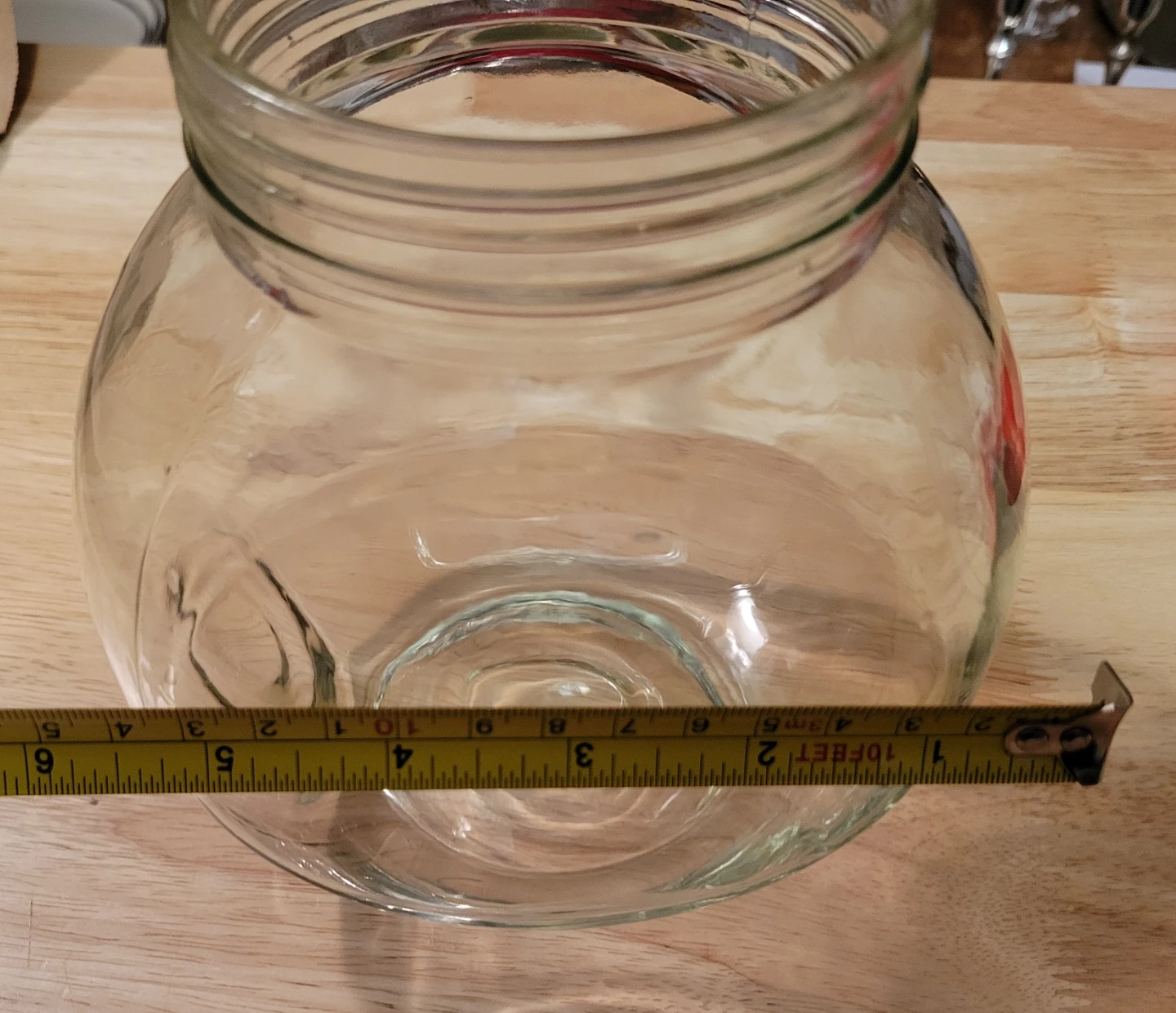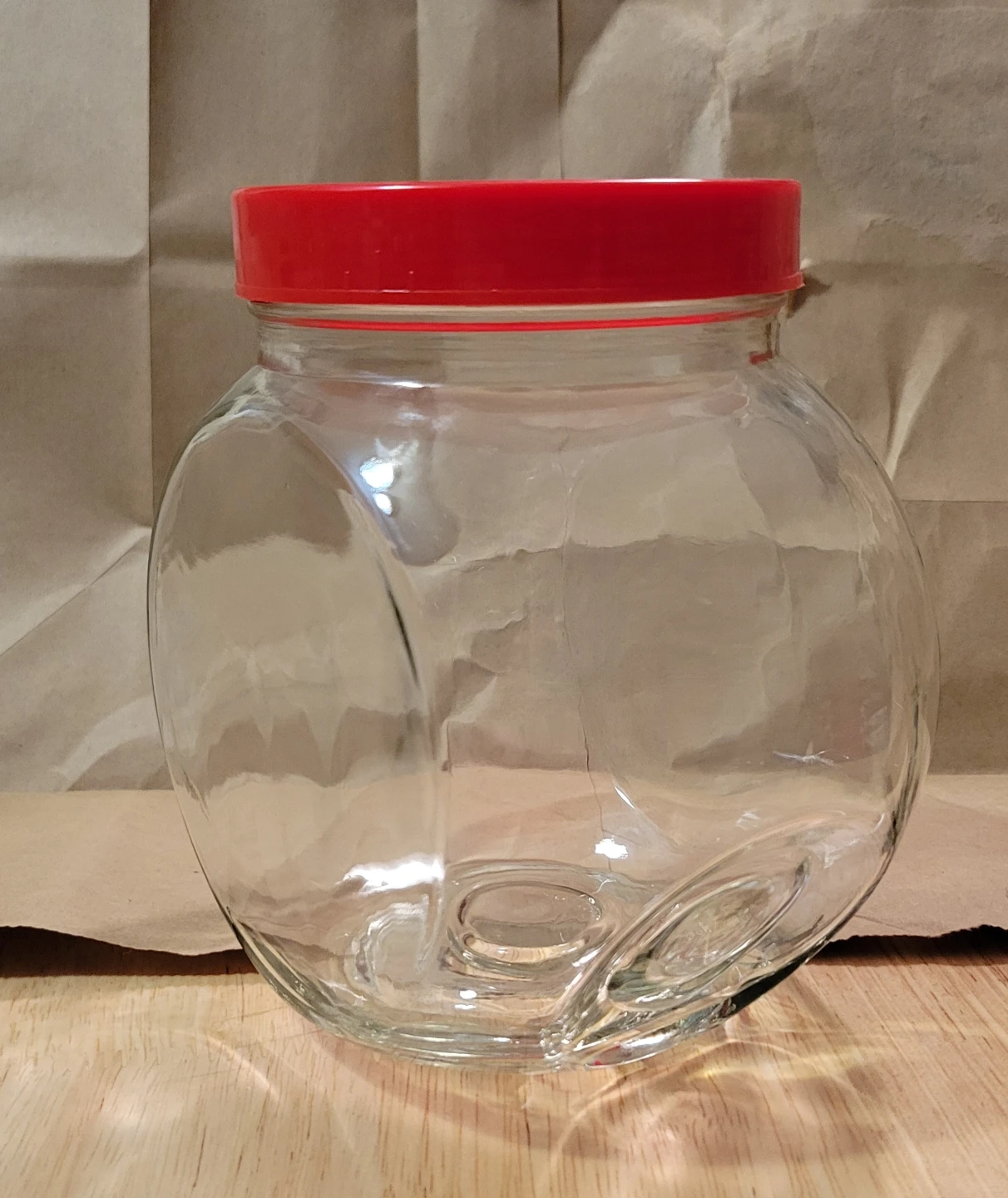 This is a clear glass jar with a red screw-on lid. It's perfect for storing dry goods like candy, cookies, or craft supplies. The jar is made of sturdy glass and has a wide opening for easy access.