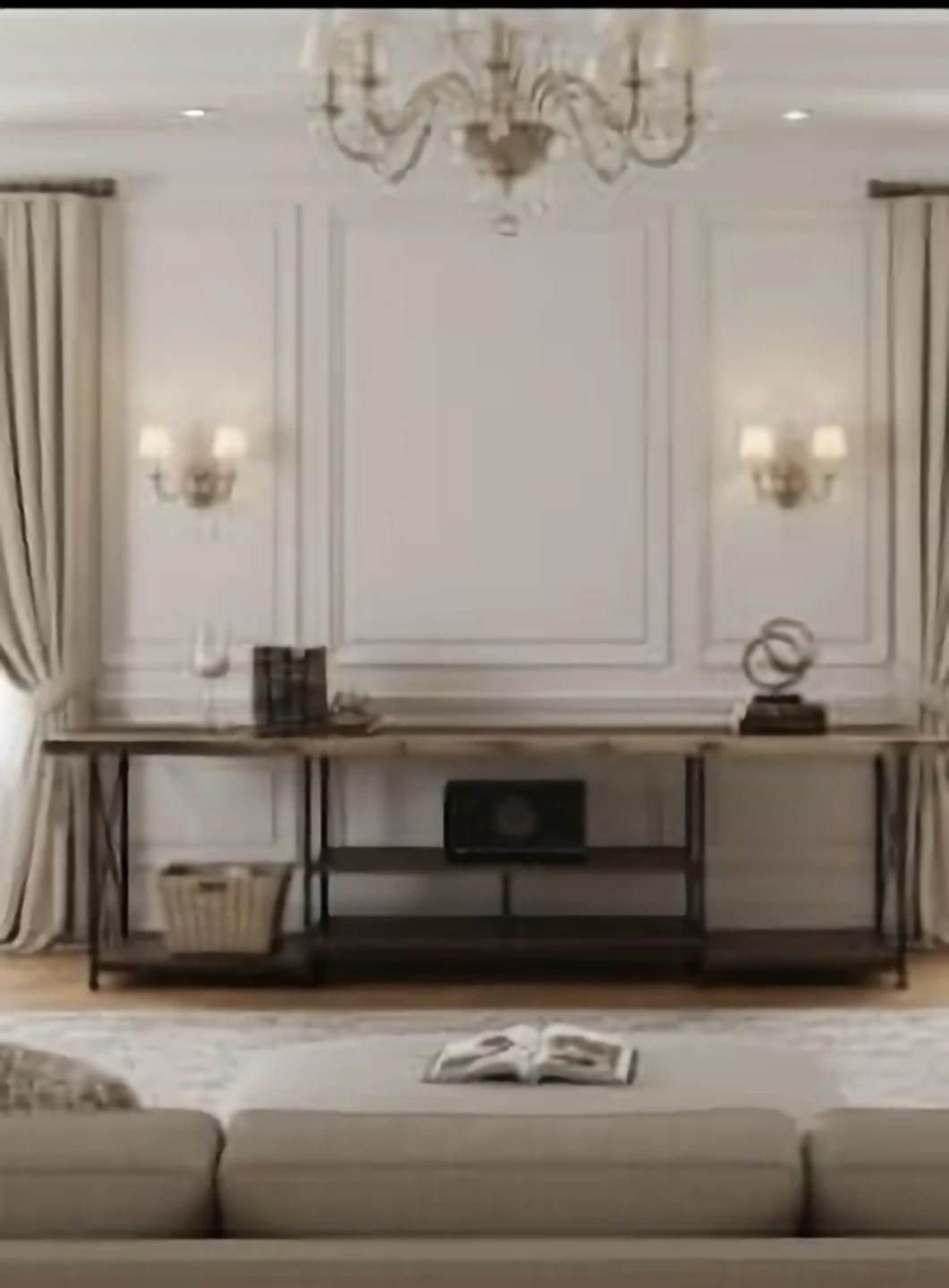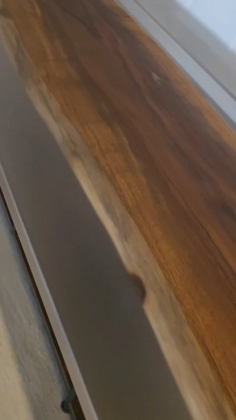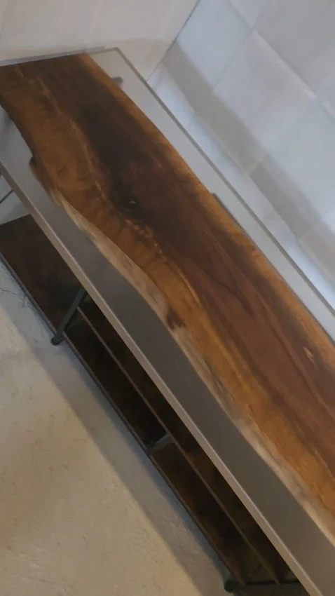 This WOOD and EPOXY T.V stand features a rustic wood top and a durable black metal frame with cross detailing. It includes open shelves for storage or display. It's perfect for a living room or bedroom.