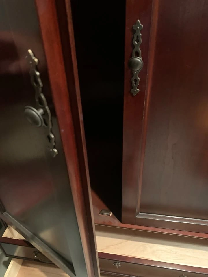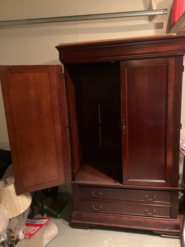 This armoire features 2 wide drawers at the bottom and a tall cabinet with swinging doors. The cabinet can be used for a TV (it has holes in the back for wires), general storage, or hanging clothes (there is a bar at the top). Dimensions: L: 1.07 m x W: 0.64 m x H: 1.81 m. $300 individually.