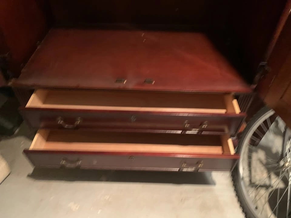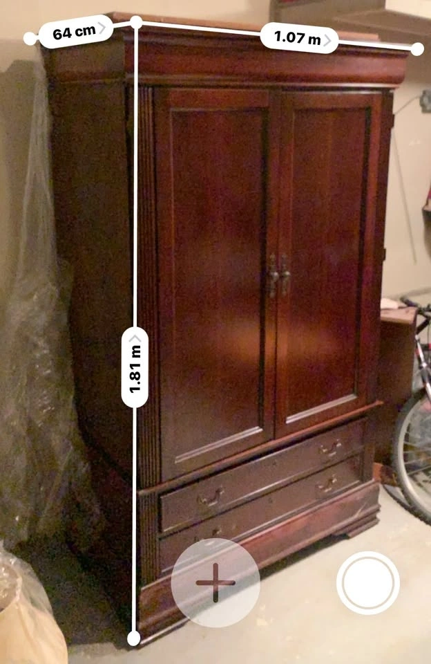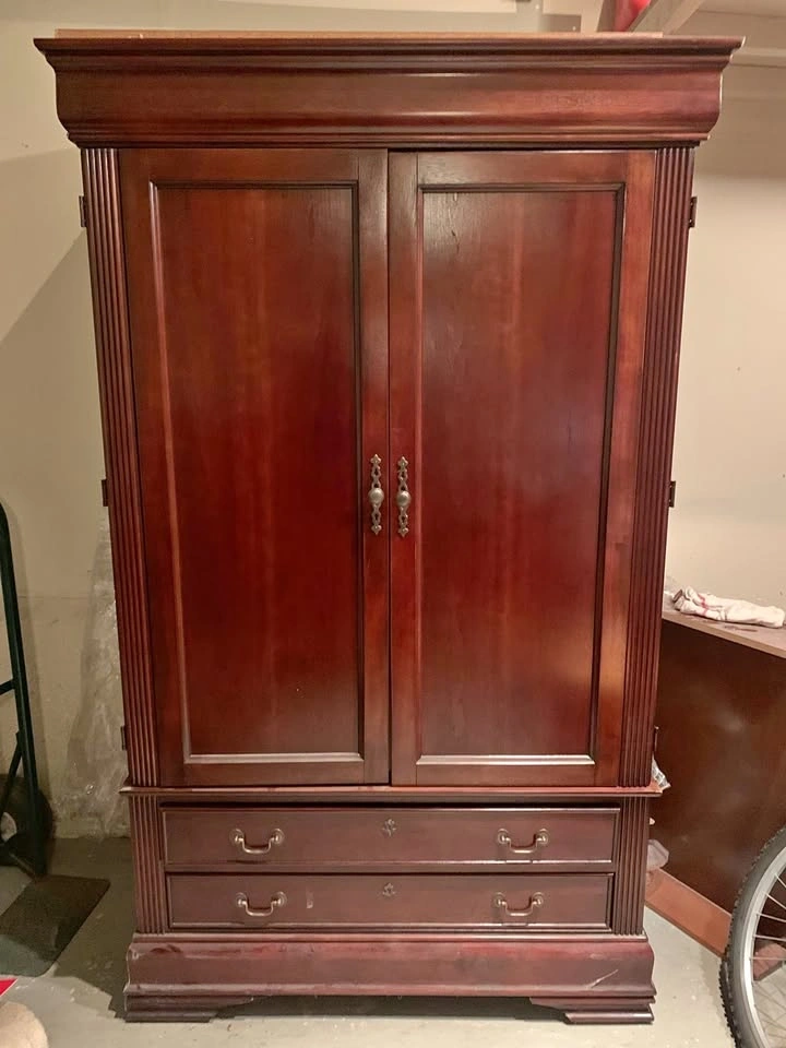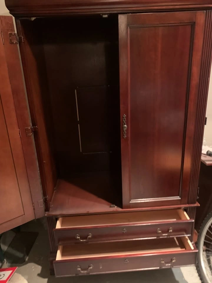 This armoire features 2 wide drawers at the bottom and a tall cabinet with swinging doors. The cabinet can be used for a TV (it has holes in the back for wires), general storage, or hanging clothes (there is a bar at the top). Dimensions: L: 1.07 m x W: 0.64 m x H: 1.81 m. $300 individually.
