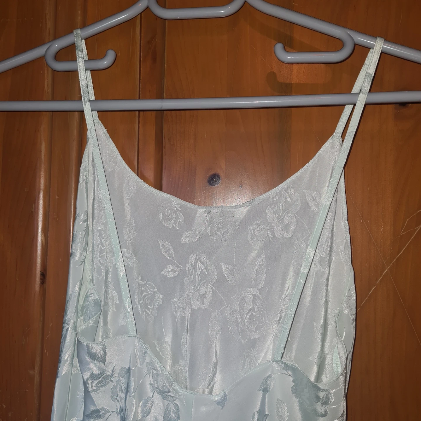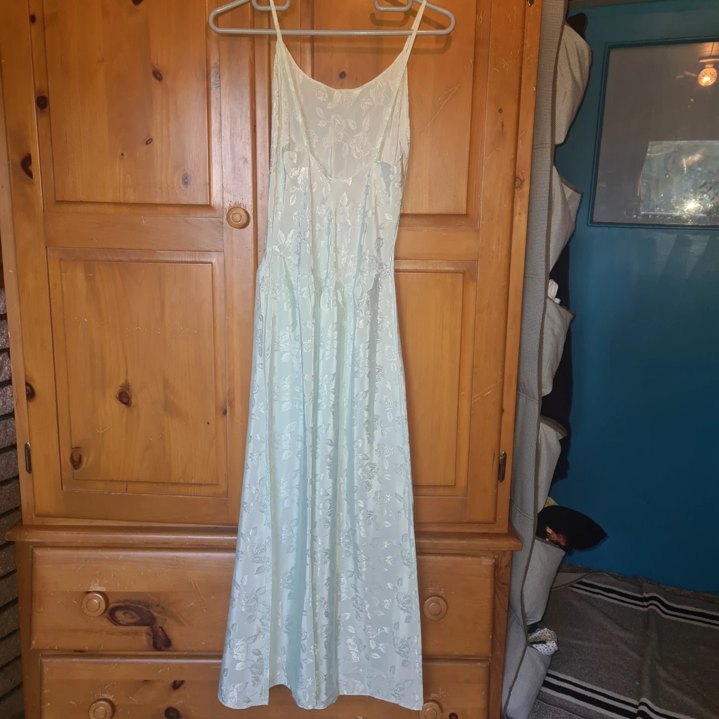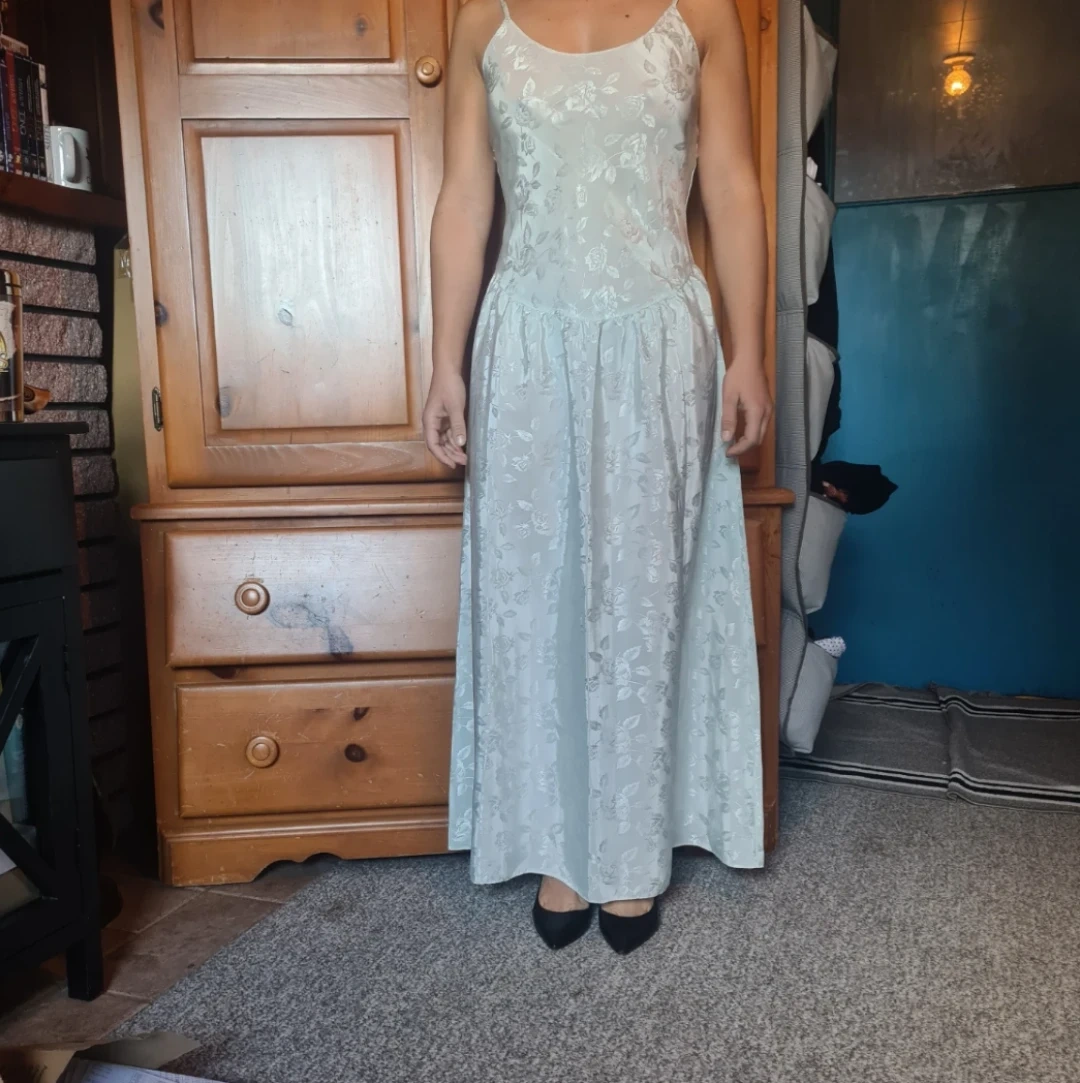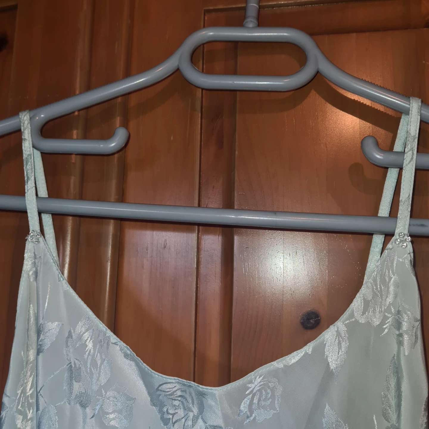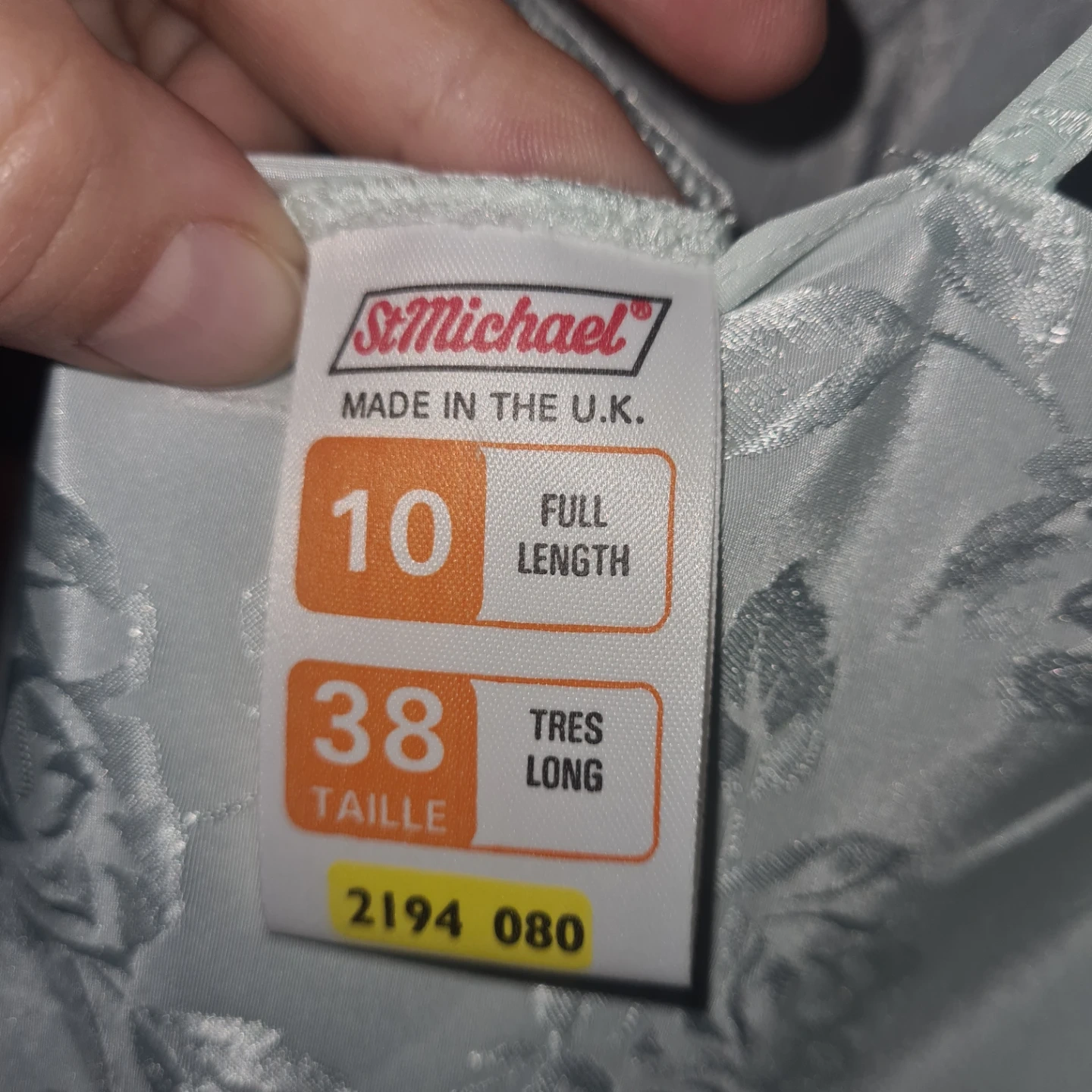 A light blue maxi dress with a delicate floral pattern from the brand ST MICHAEL (UK). It features thin spaghetti straps and a flowing skirt. Fabric composition is polyester.