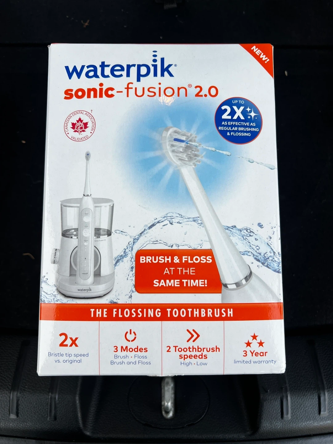 This Waterpik Sonic-Fusion 2.0 combines brushing and flossing into one step! It has 3 modes: Brush, Floss, and Brush and Floss. It also features 2 toothbrush speeds, High and Low. This model is Canadian Dental Association validated.
