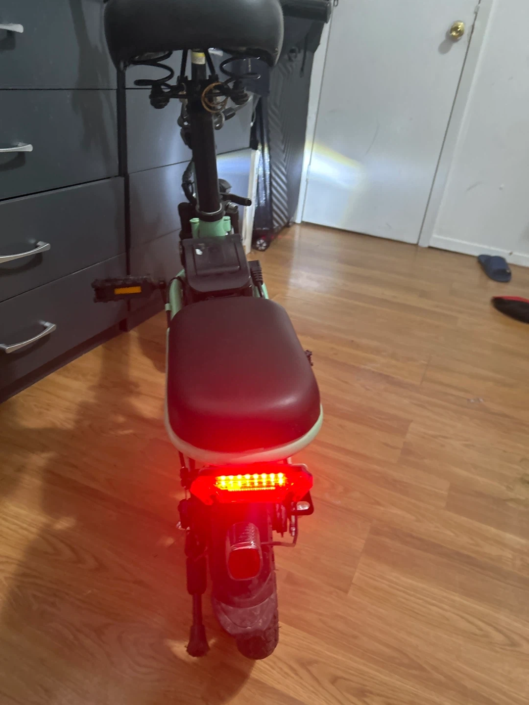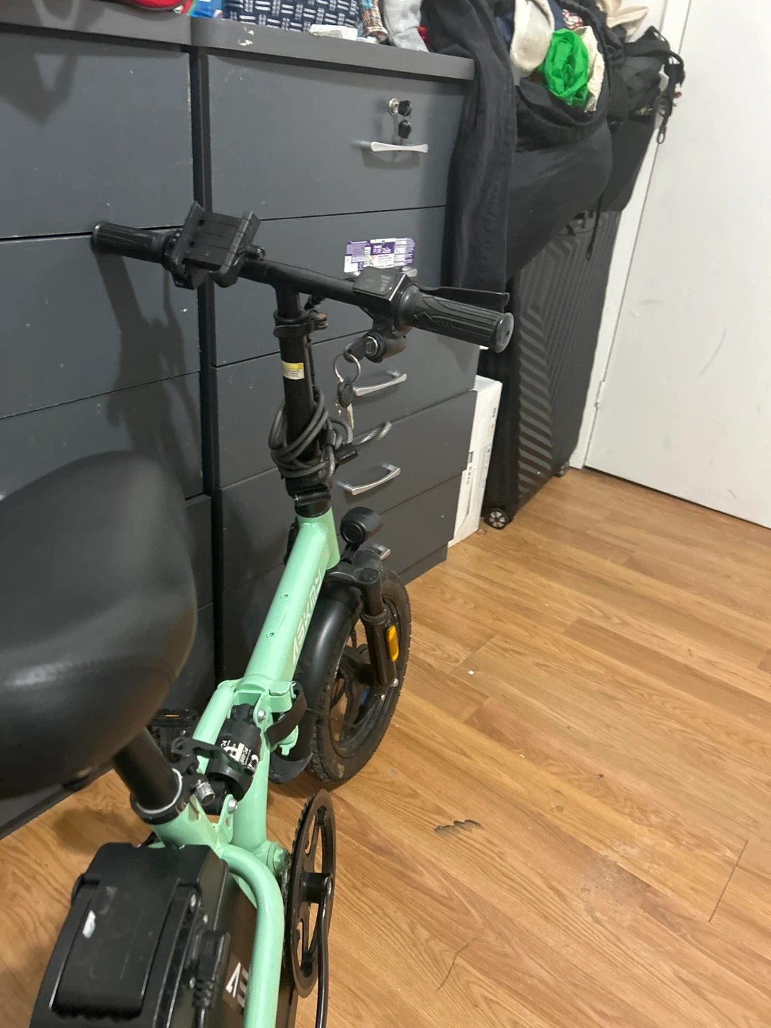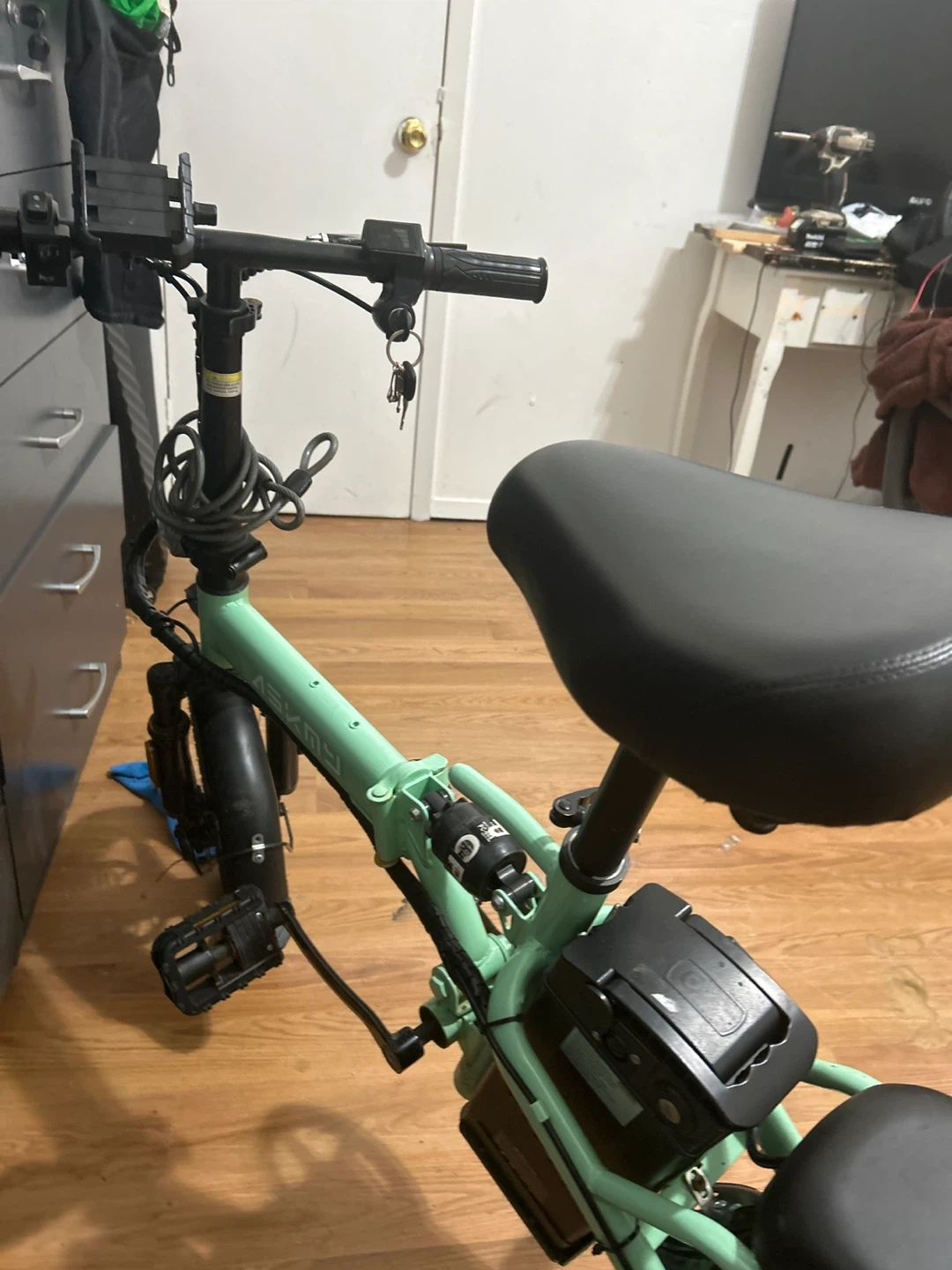 This is an ASKMY electric folding bike in a mint green color. It's a convenient way to get around town. It includes a battery and charger. Works very good