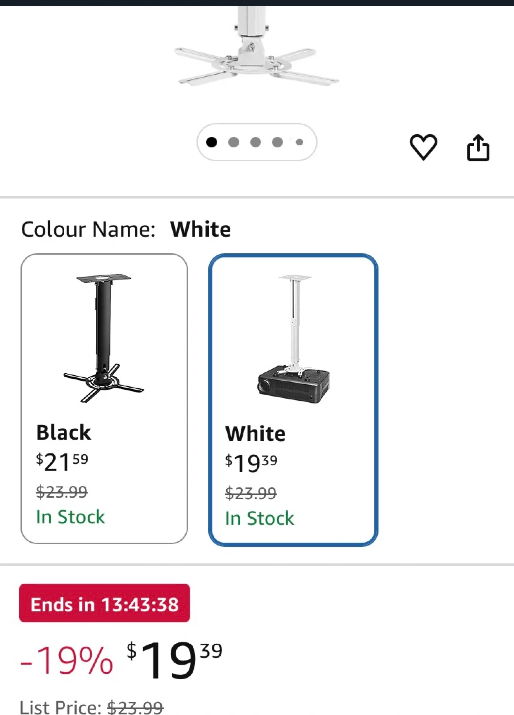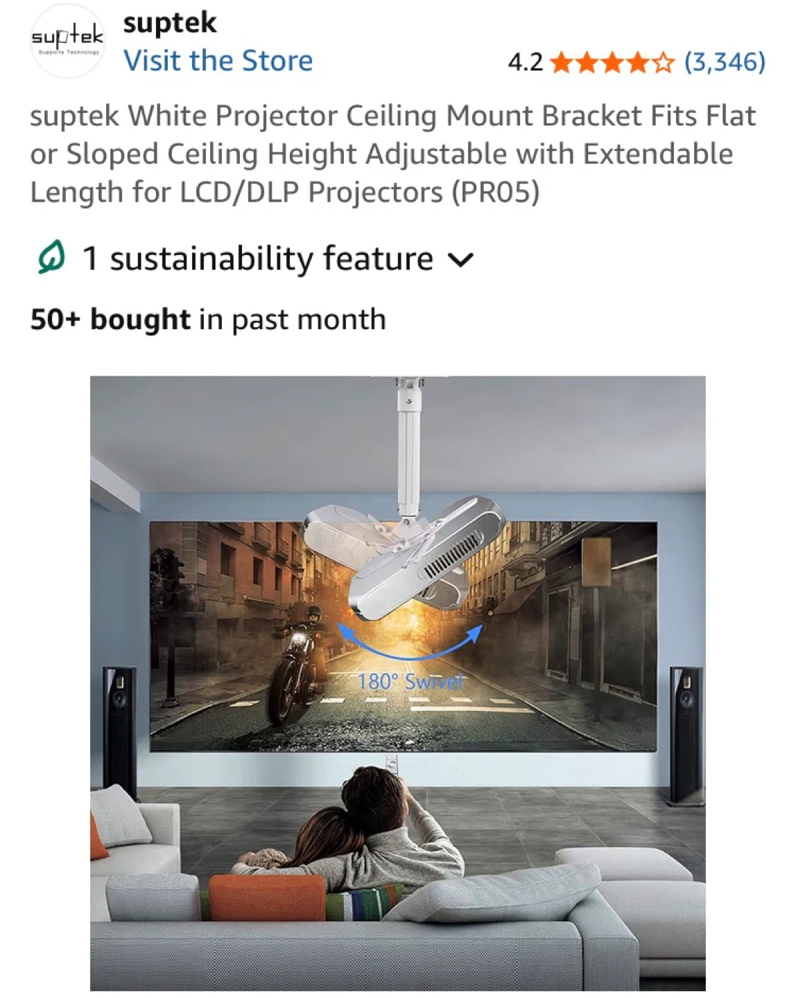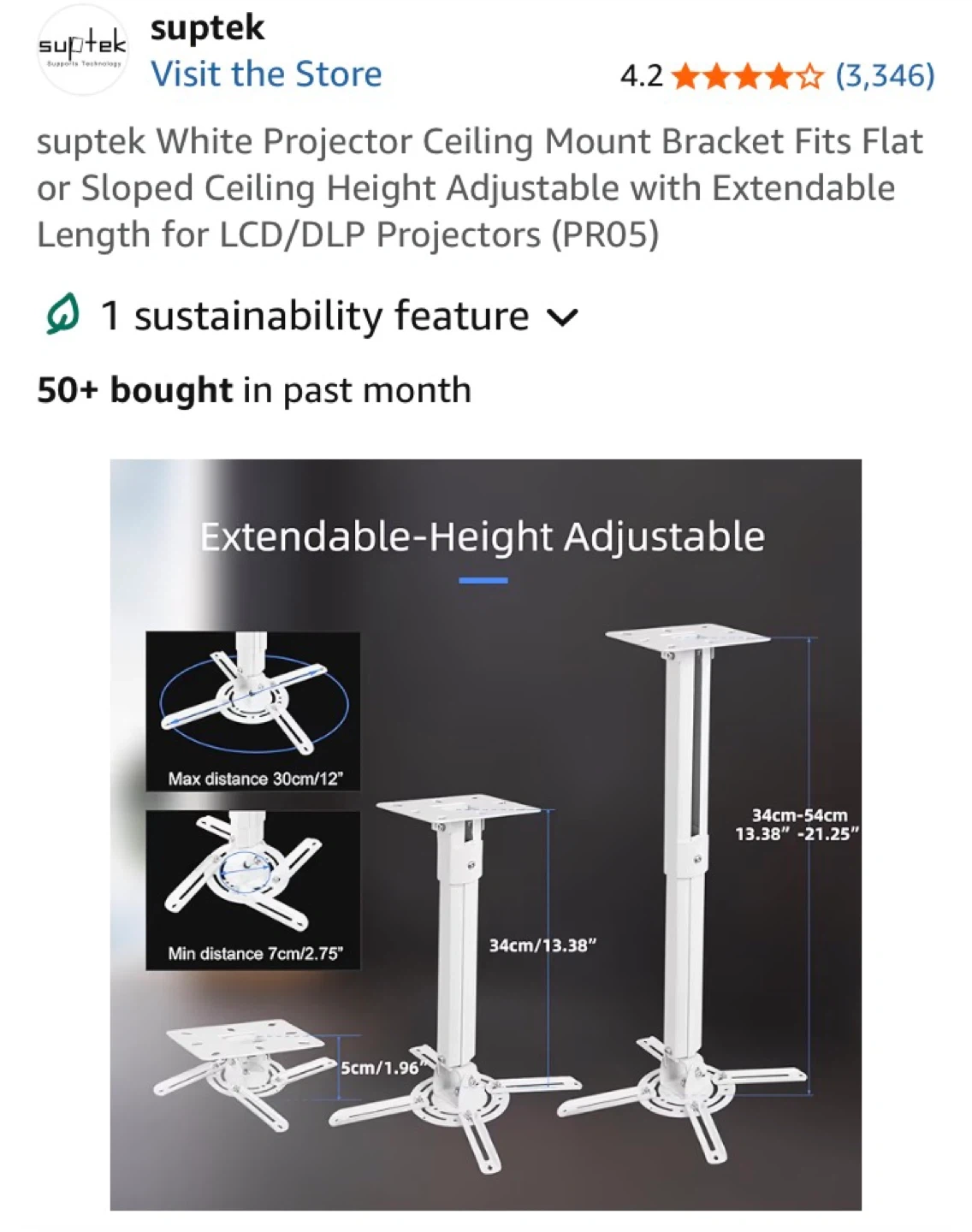 This is a white Suptek projector ceiling mount bracket. It's height adjustable with an extendable length. The bracket fits flat or sloped ceilings.