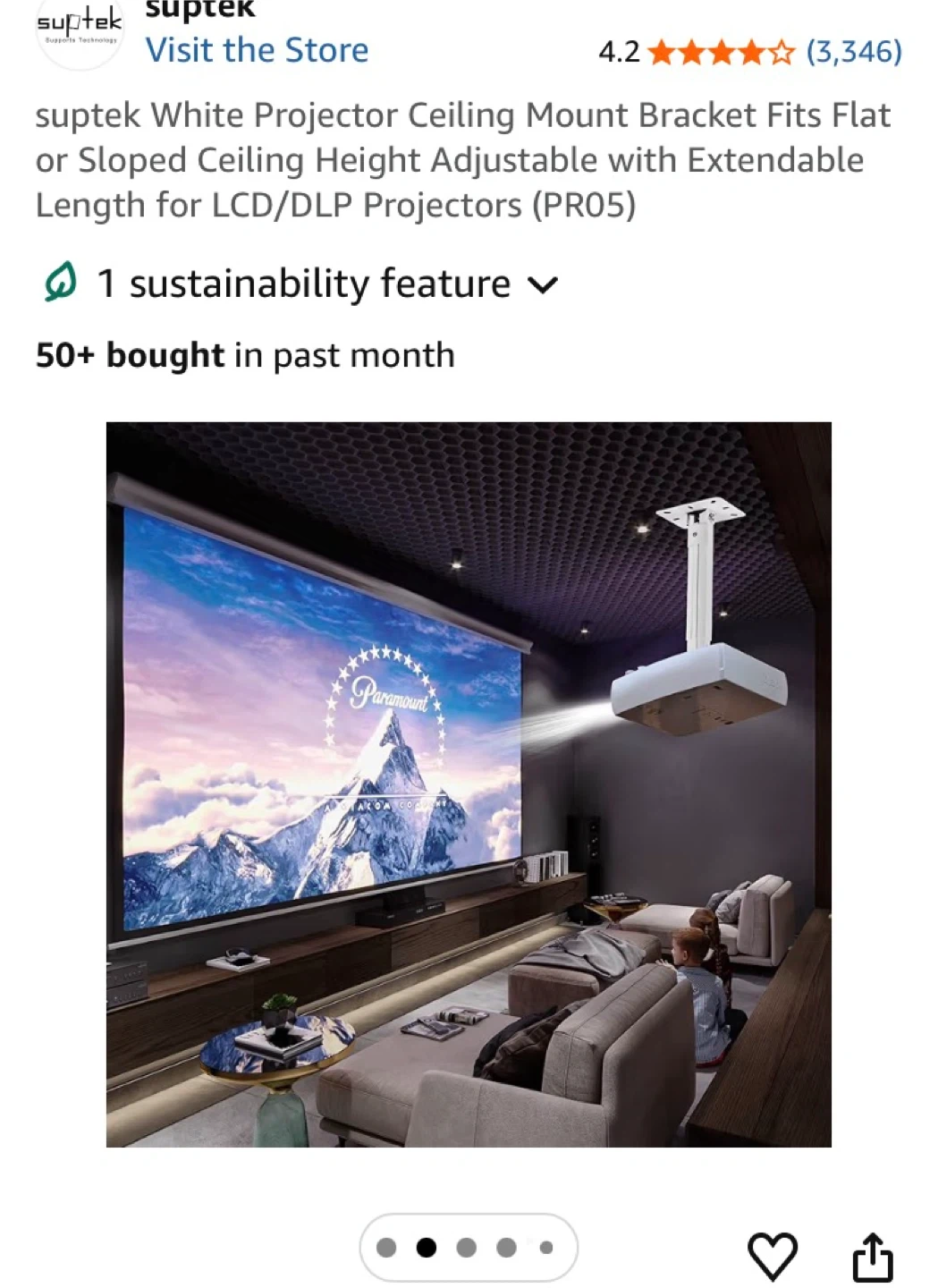 This is a white Suptek projector ceiling mount bracket. It's height adjustable with an extendable length. The bracket fits flat or sloped ceilings.