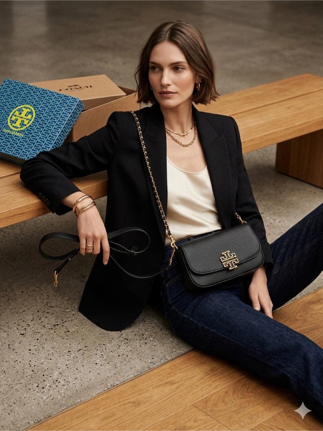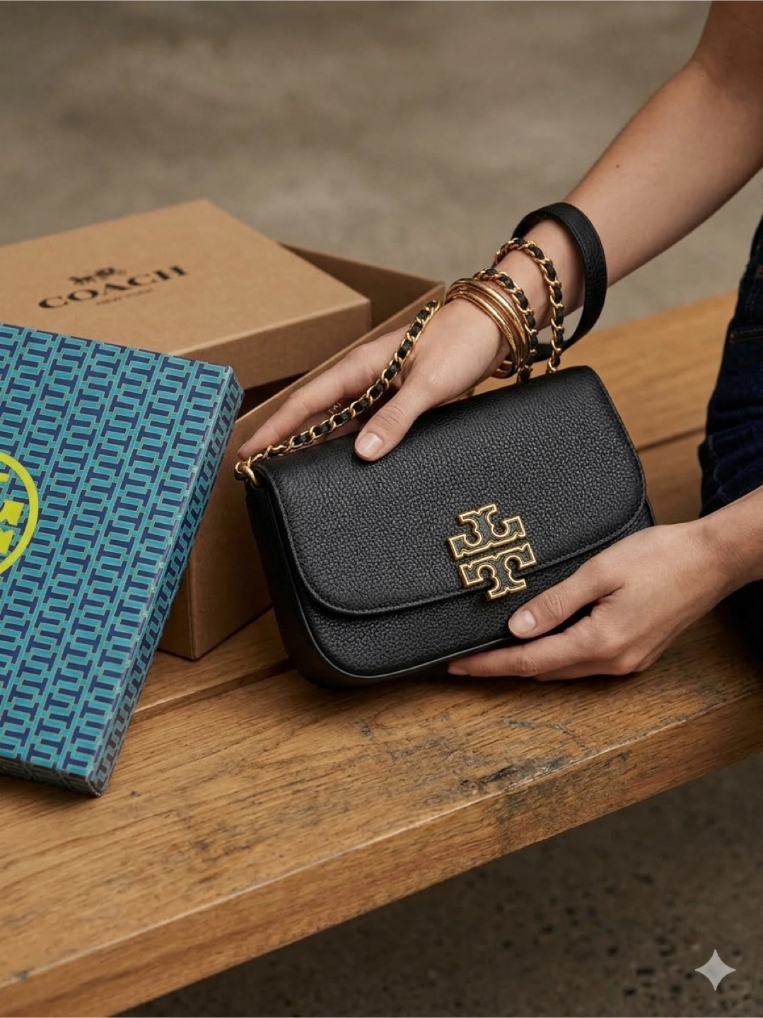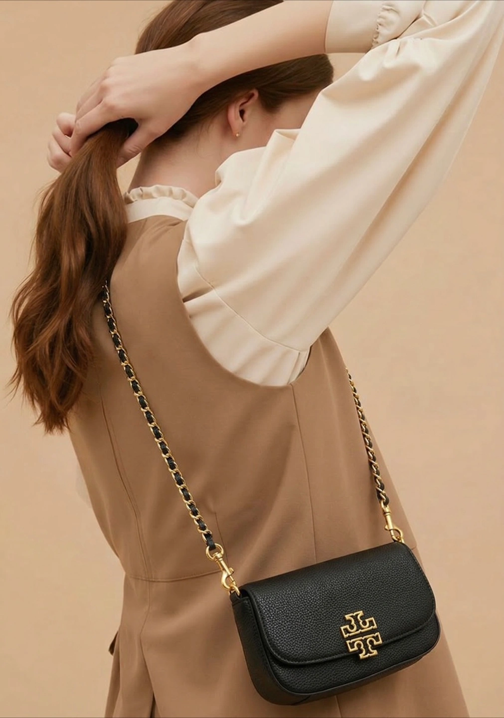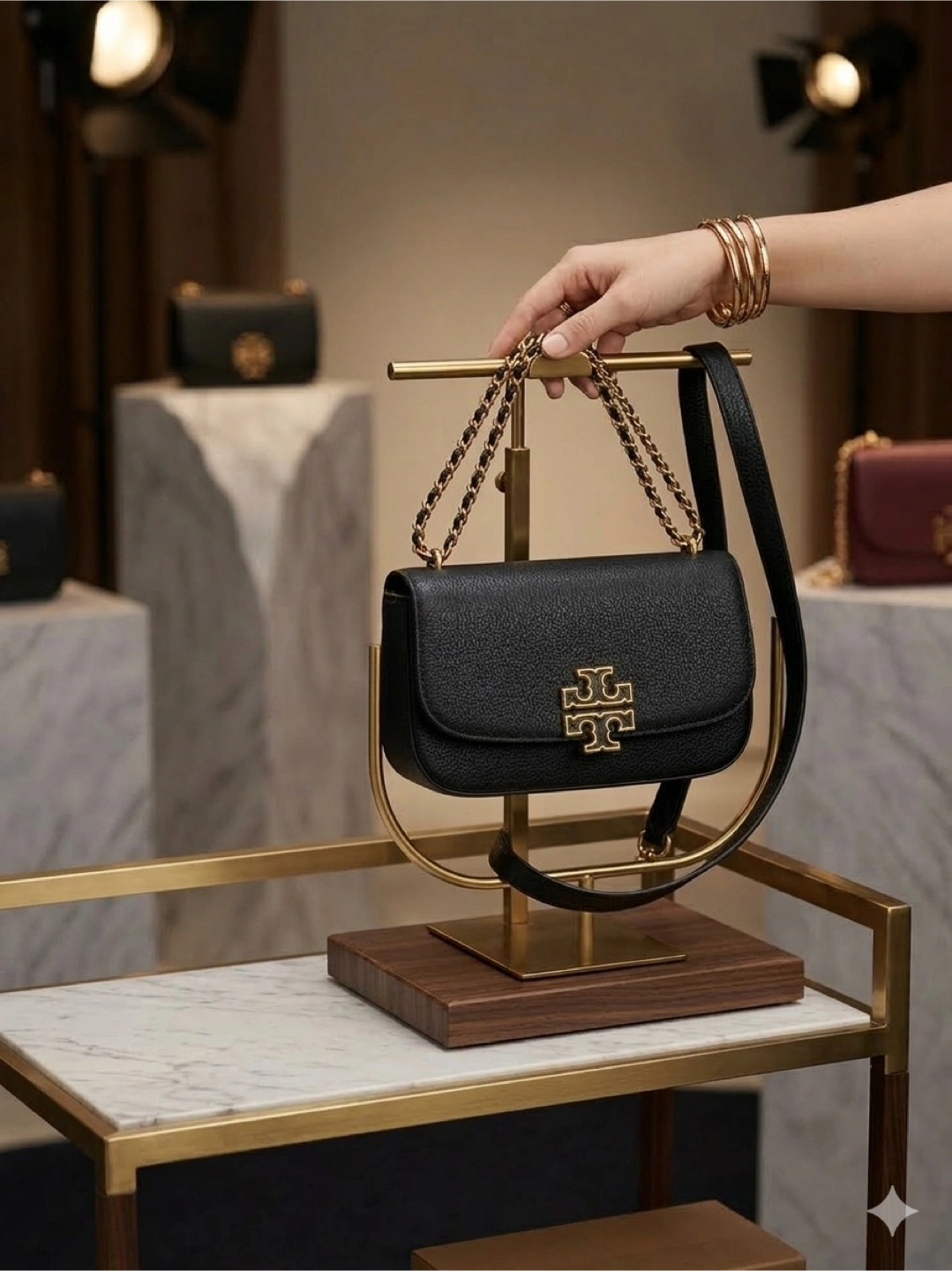 This is a Tory Burch shoulder bag in black leather with a chevron design. It features a gold-tone chain strap and the signature Tory Burch logo hardware. It's a stylish accessory for any occasion.