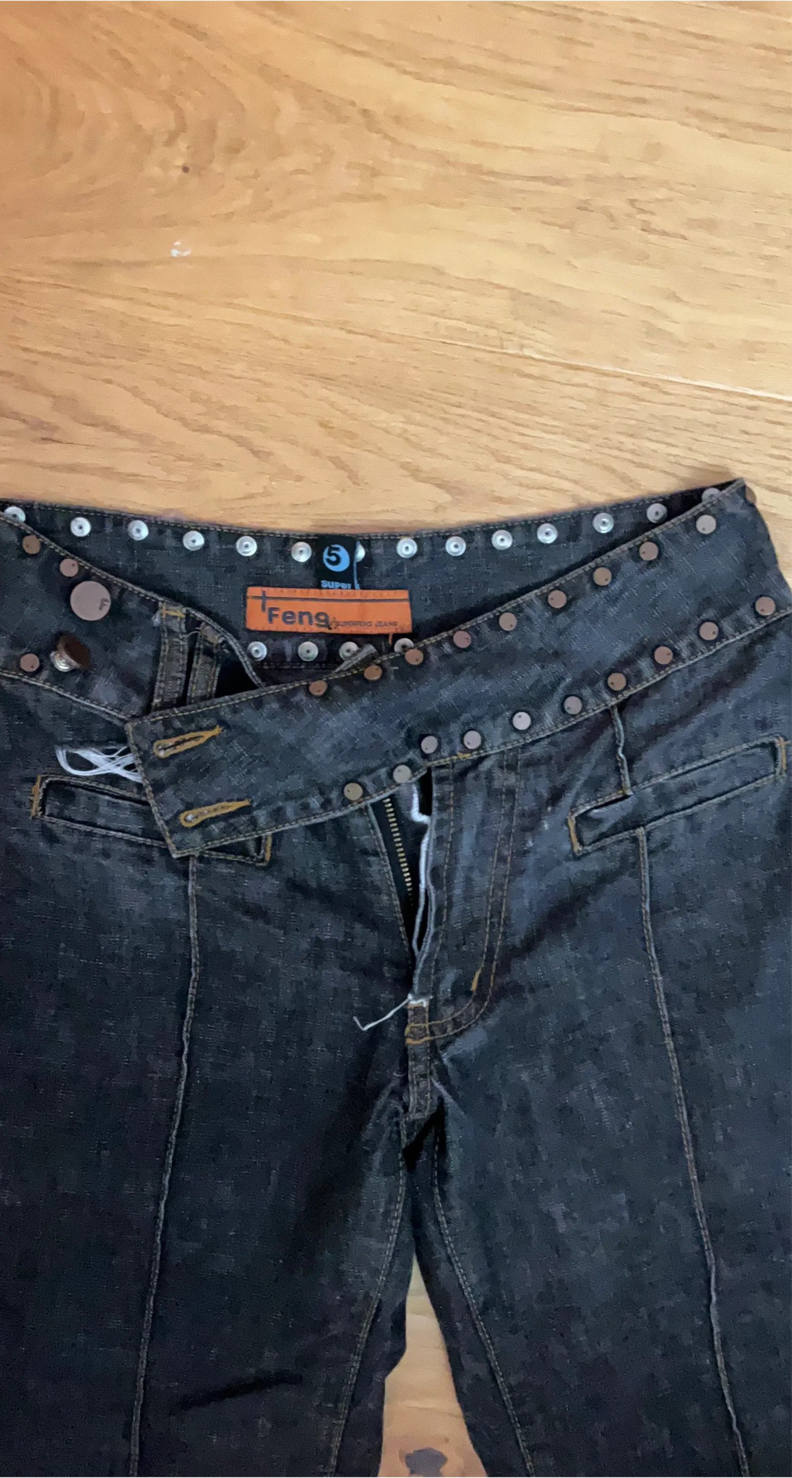 These are dark wash vintage Feng brand jeans. They're a stylish bootcut fit with decorative stud detailing along the waistband. Perfect for dressing up or down!