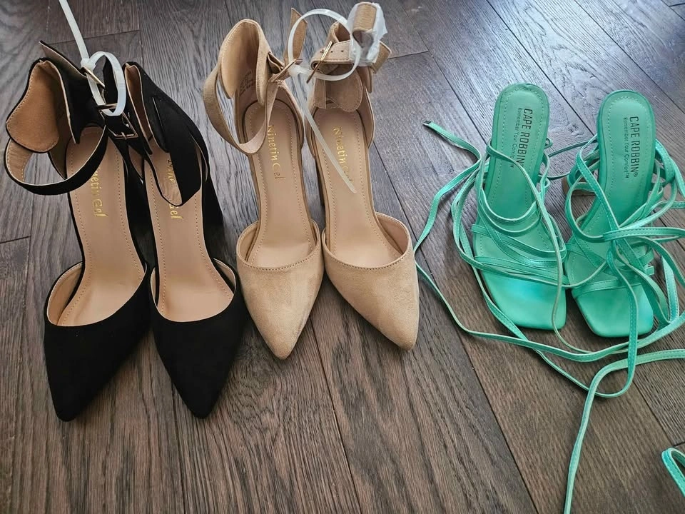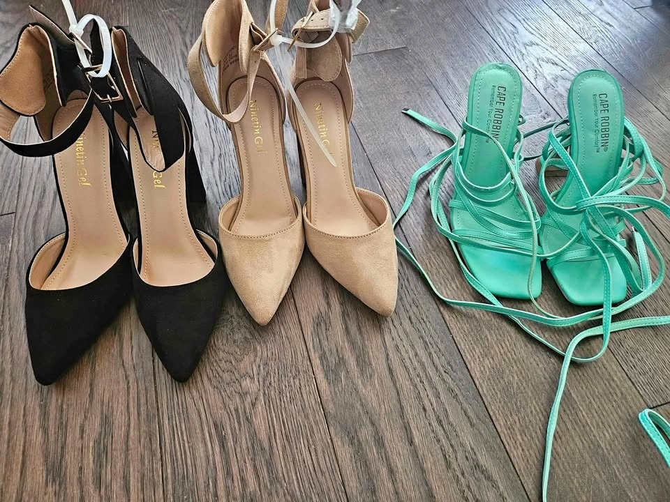 Black heels size 7.5, beige brown heels size 6.5, and green heels size 6. Black and beige are Ninetin Gel brand, green is Cape Robbin. Each pair is just $5. From a pet-free and smoke-free home.