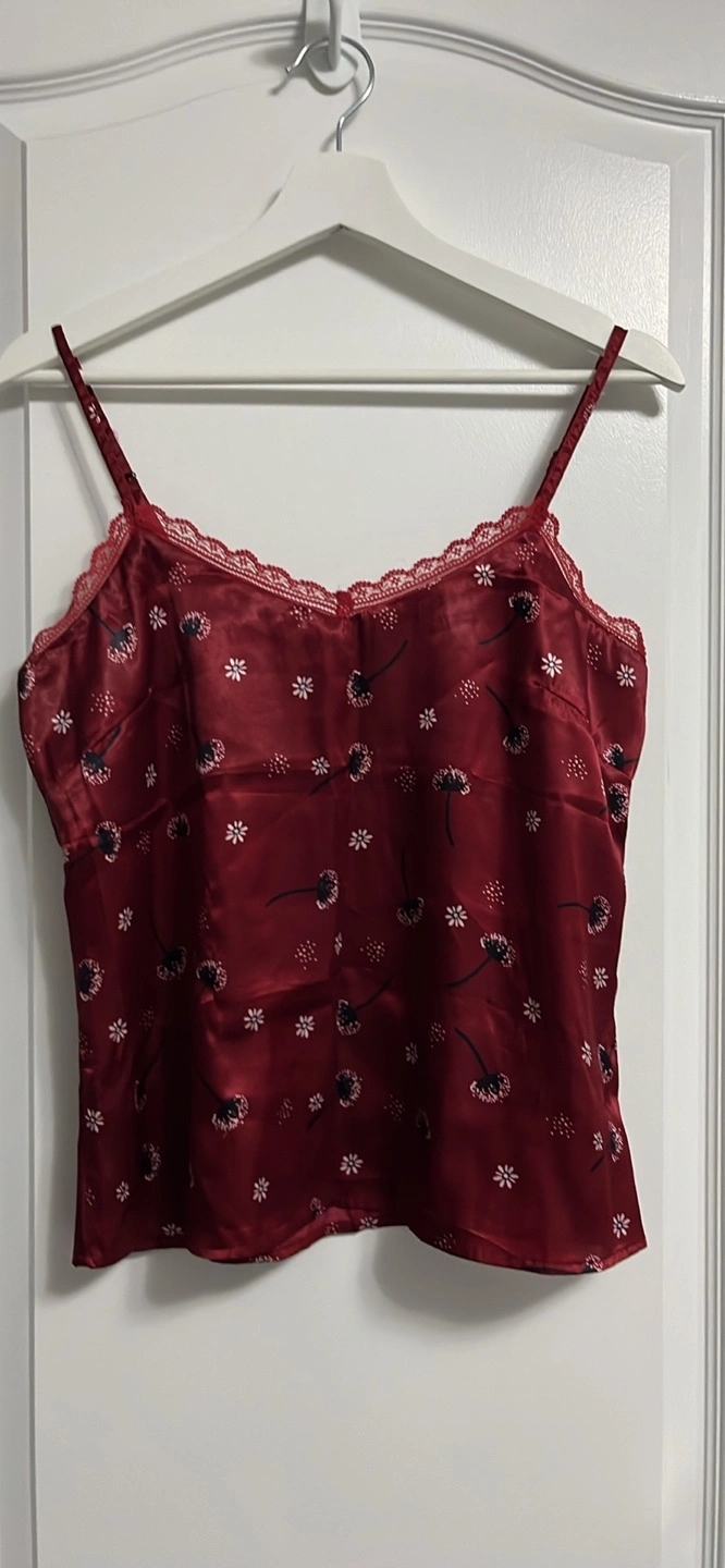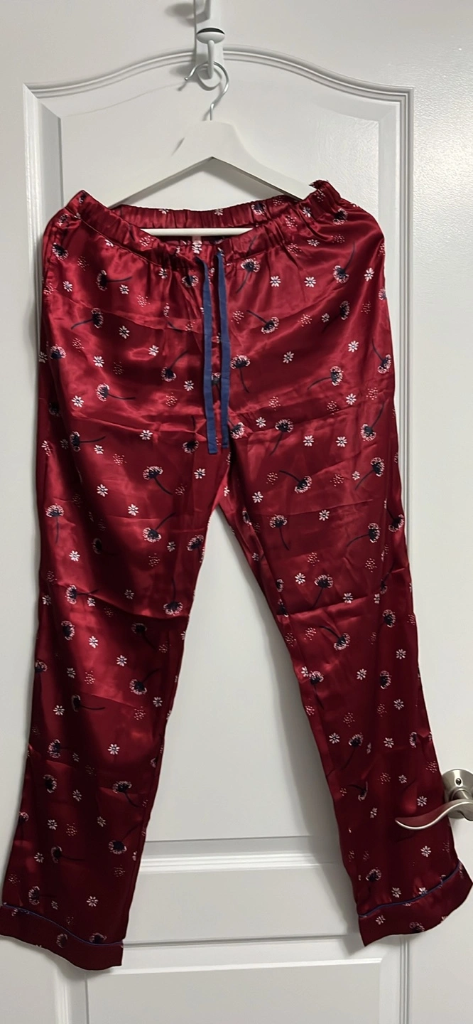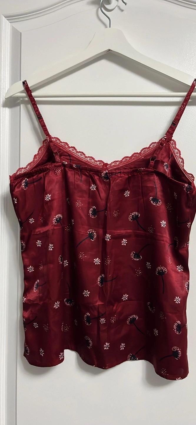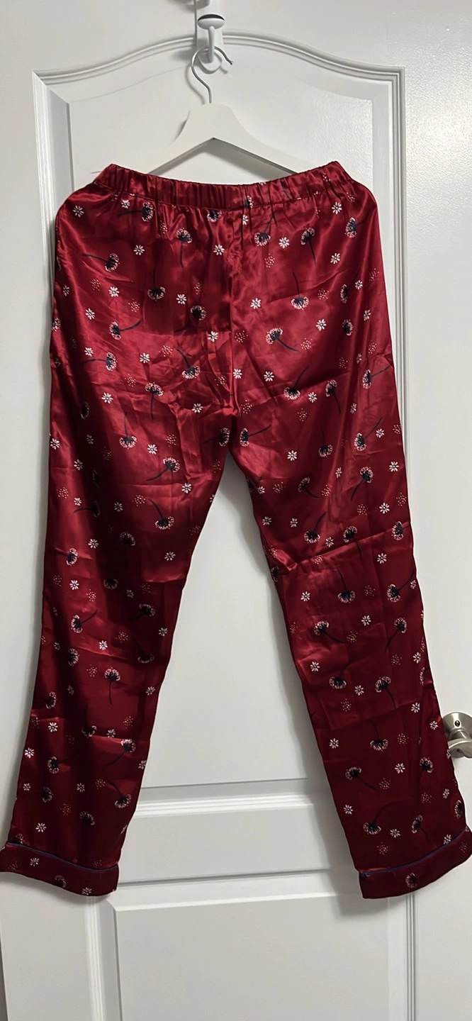 Matching pajama set. Red satin fabric. Dandelion print. Includes cami top and pyjama pants. Relaxed fit.