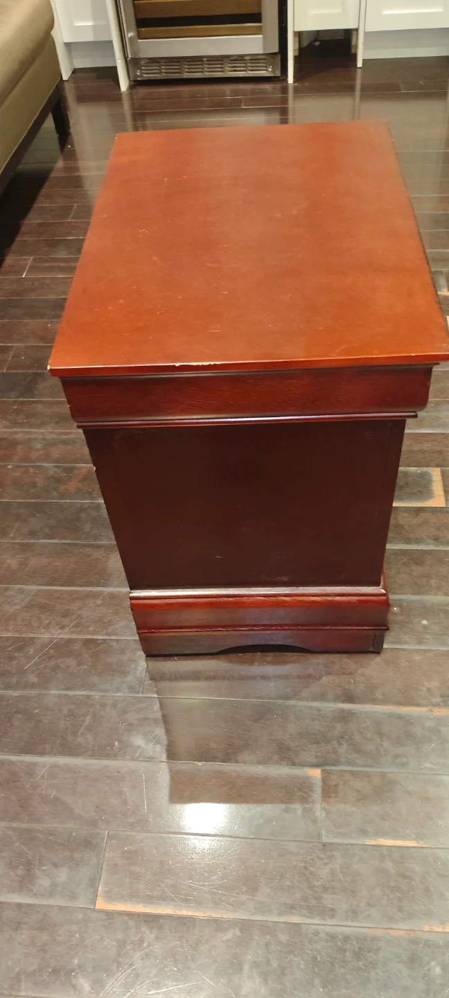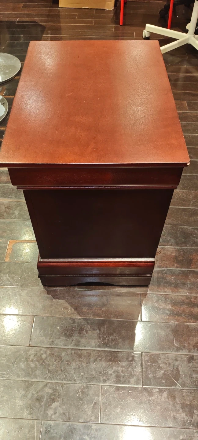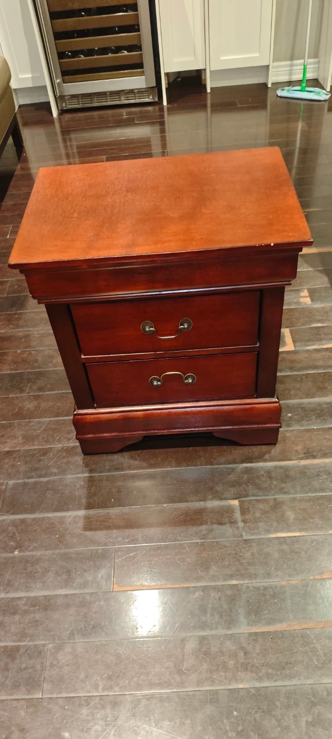 This night stand is a sturdy piece with a classic design, perfect for any bedroom. It features two drawers for convenient storage. This is a used item that has some wear and tear but still in good condition. If the ad is up, it's still available!