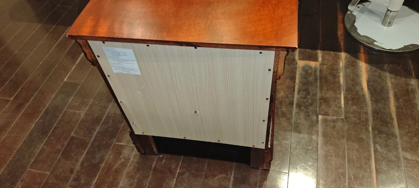 This night stand is a sturdy piece with a classic design, perfect for any bedroom. It features two drawers for convenient storage. This is a used item that has some wear and tear but still in good condition. If the ad is up, it's still available!
