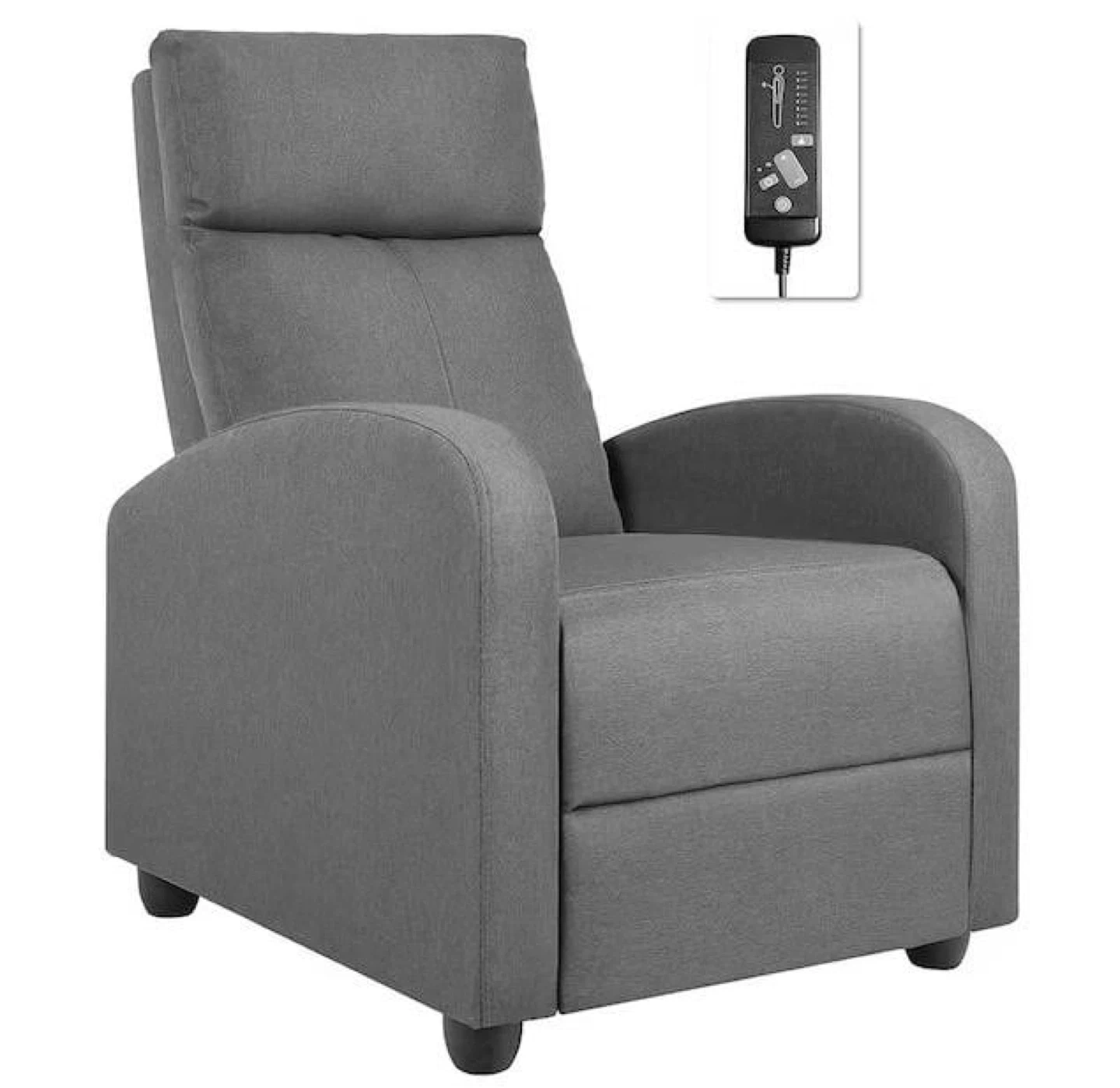 Selling a comfy grey fabric recliner chair! It comes with a remote for easy adjustments. The dimensions are approximately 38.6 inches in height, 20.5 inches in width, and 62.6 inches in length when fully reclined. Perfect for relaxing after a long day