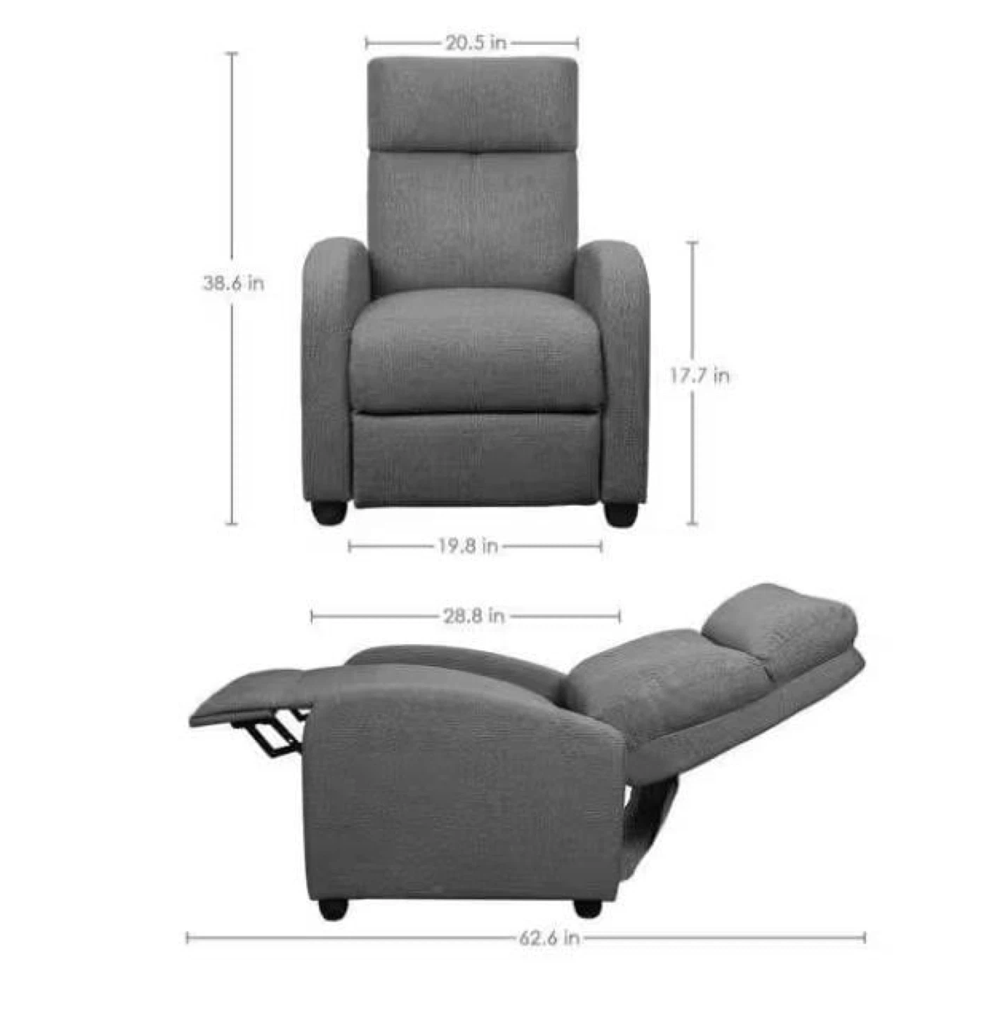 Selling a comfy grey fabric recliner chair! It comes with a remote for easy adjustments. The dimensions are approximately 38.6 inches in height, 20.5 inches in width, and 62.6 inches in length when fully reclined. Perfect for relaxing after a long day