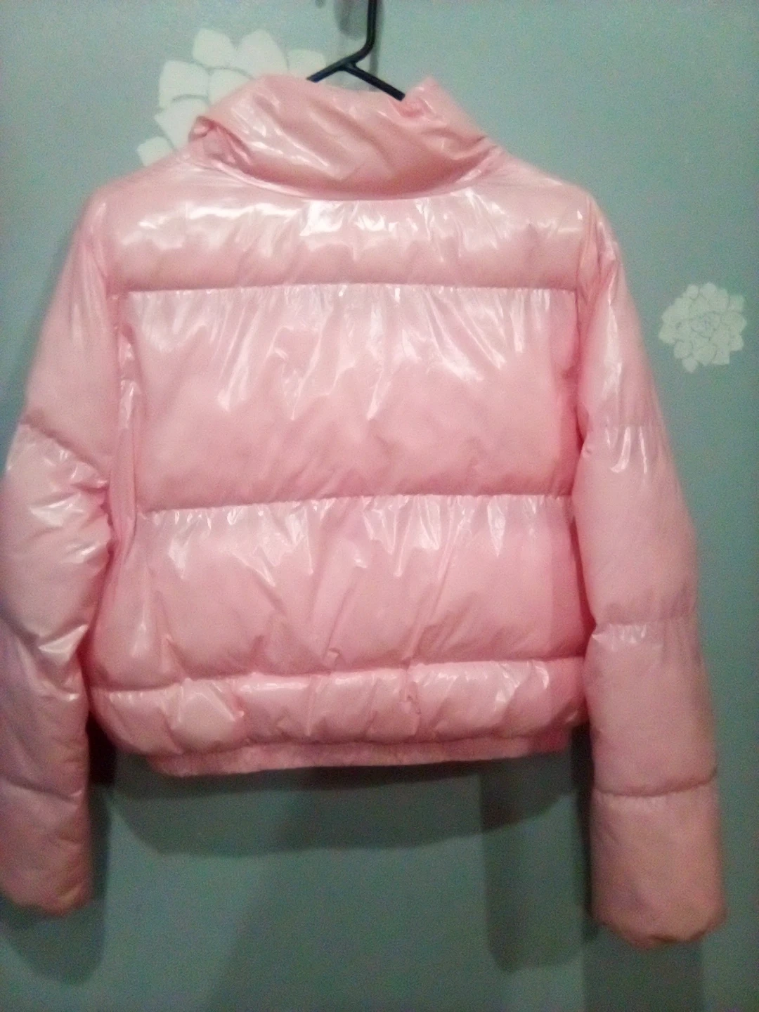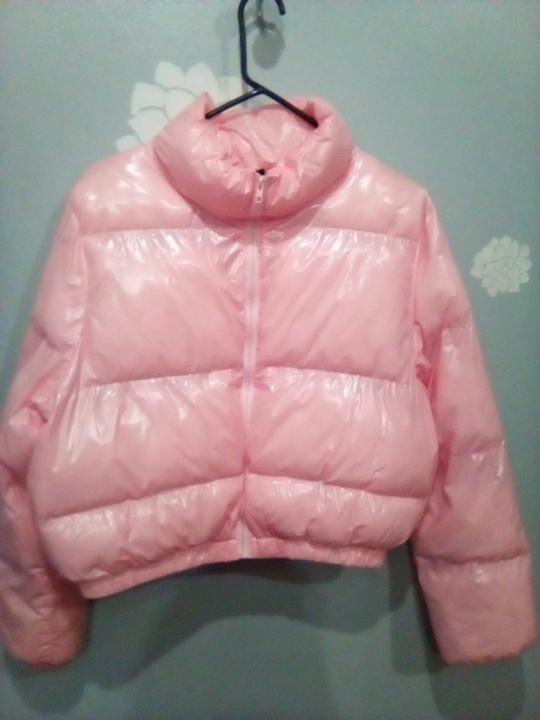 This is a pink, shiny puffer jacket from SHEIN. It's a cropped style with a zip-up front and a high collar. The material is glossy and water-resistant, perfect for cooler, damp days! Worn but in good condition & it's a Large like in petite/small females