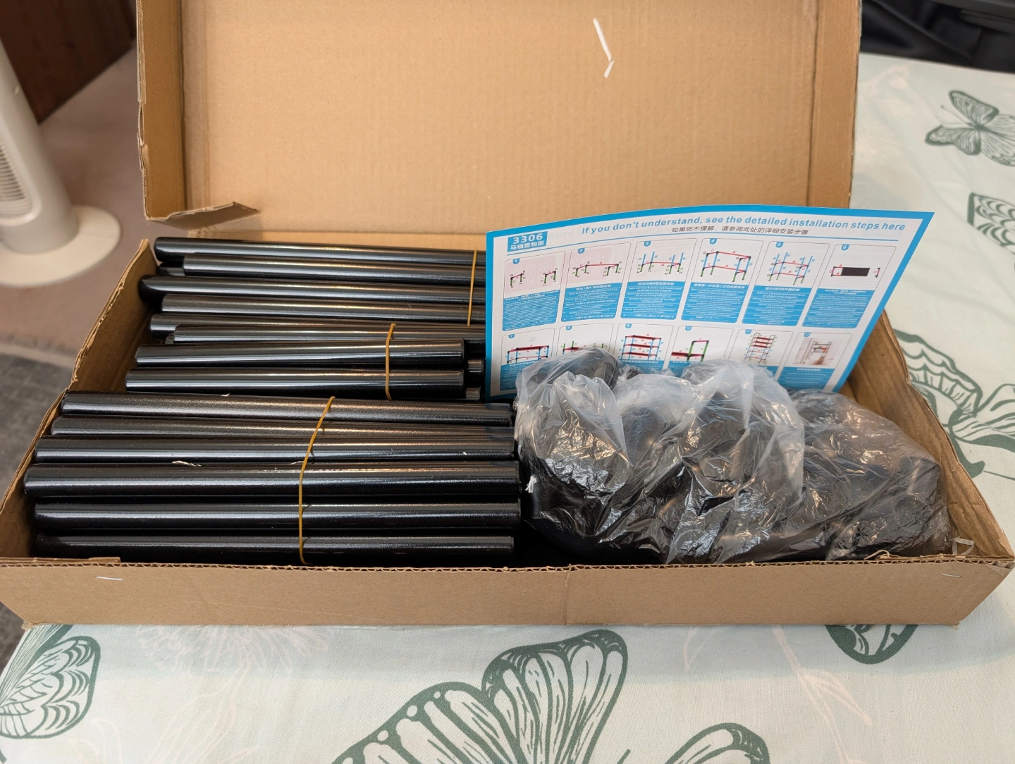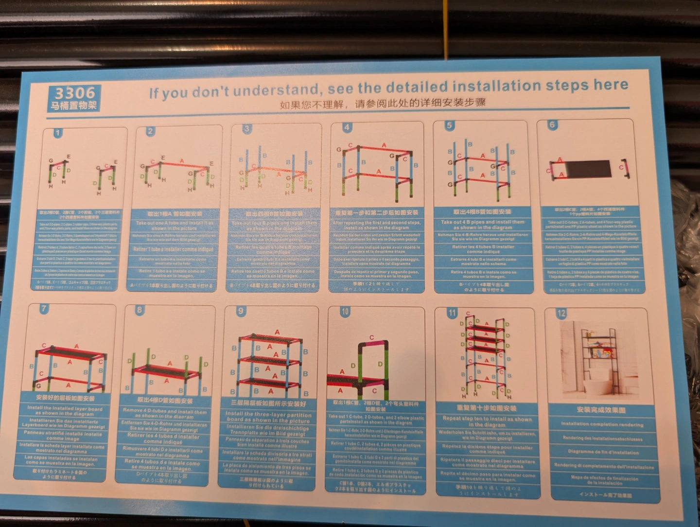 Comes with all the parts intact and accounted for. Contains an instruction manual. This organizer rack may help to reduce clutter and create more space in your bathroom if storage is not available.