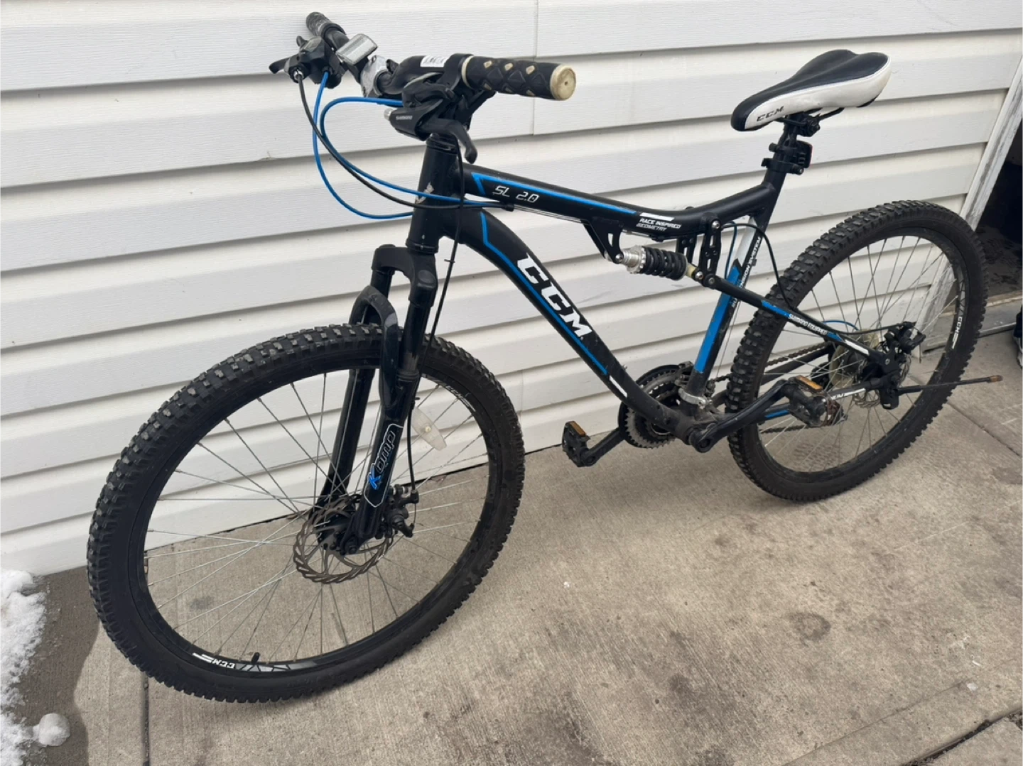 CCM Aluminum Full Suspension Mountain Bike with Disk Brakes , 21 speed , 26 inch wheels , 20 inch frame. Over $650 new. $120 cash. Firm price