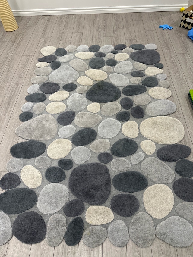 Add a touch of nature to your home with this unique pebble rug, perfect for adding texture and visual interest to any room. This used rug features a variety of grey, charcoal and cream-coloured 'stones' creating a visually appealing and comfortable surface underfoot. The rug is in good condition, with some signs of wear. It's like walking on a river of comfort without getting your socks wet! If the ad is up, the rug is ready for a new home. Cash accepted.