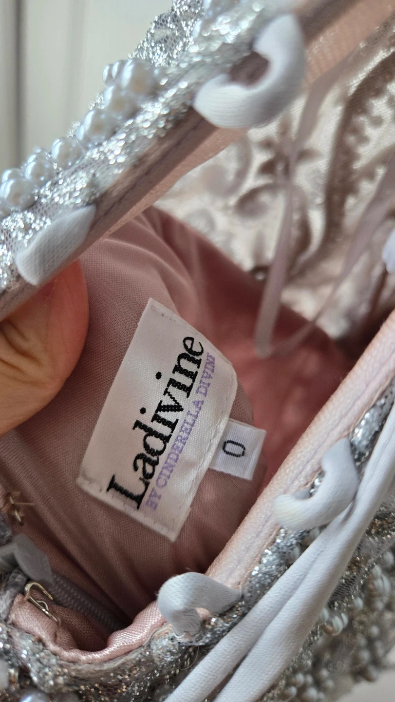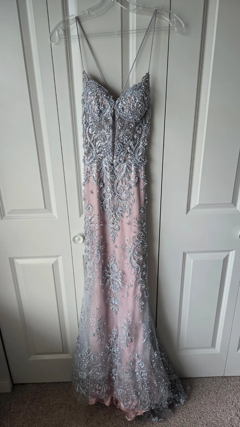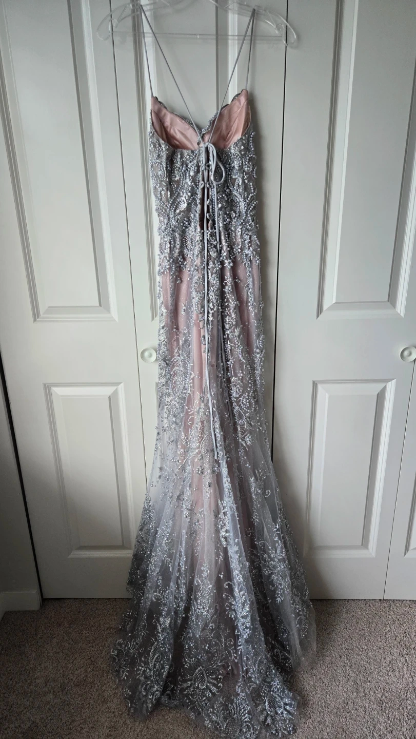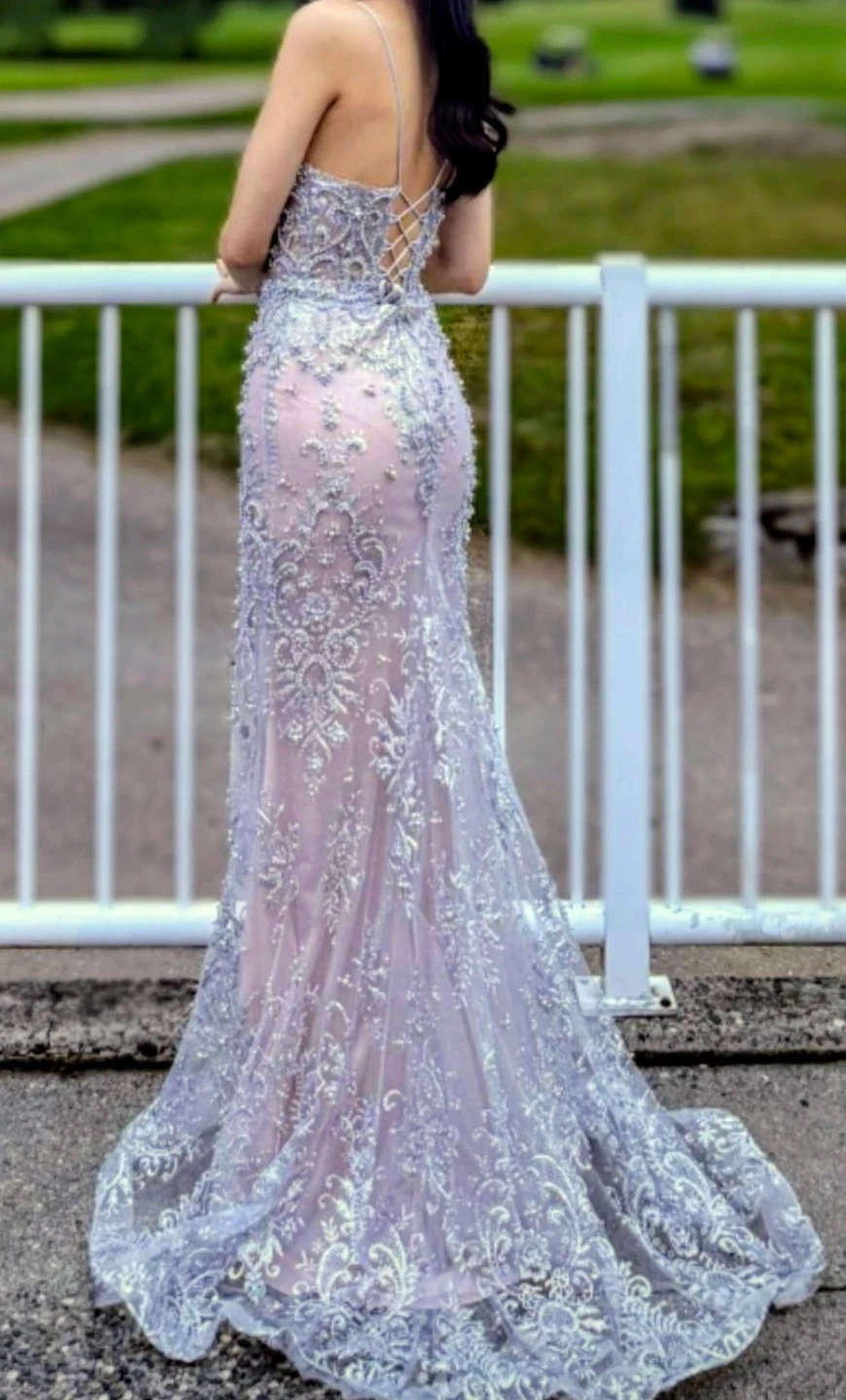 Stunning formal gown with intricate beadwork and lace detailing. It features a fitted silhouette and a flowing train. Made with delicate materials for a luxurious feel.