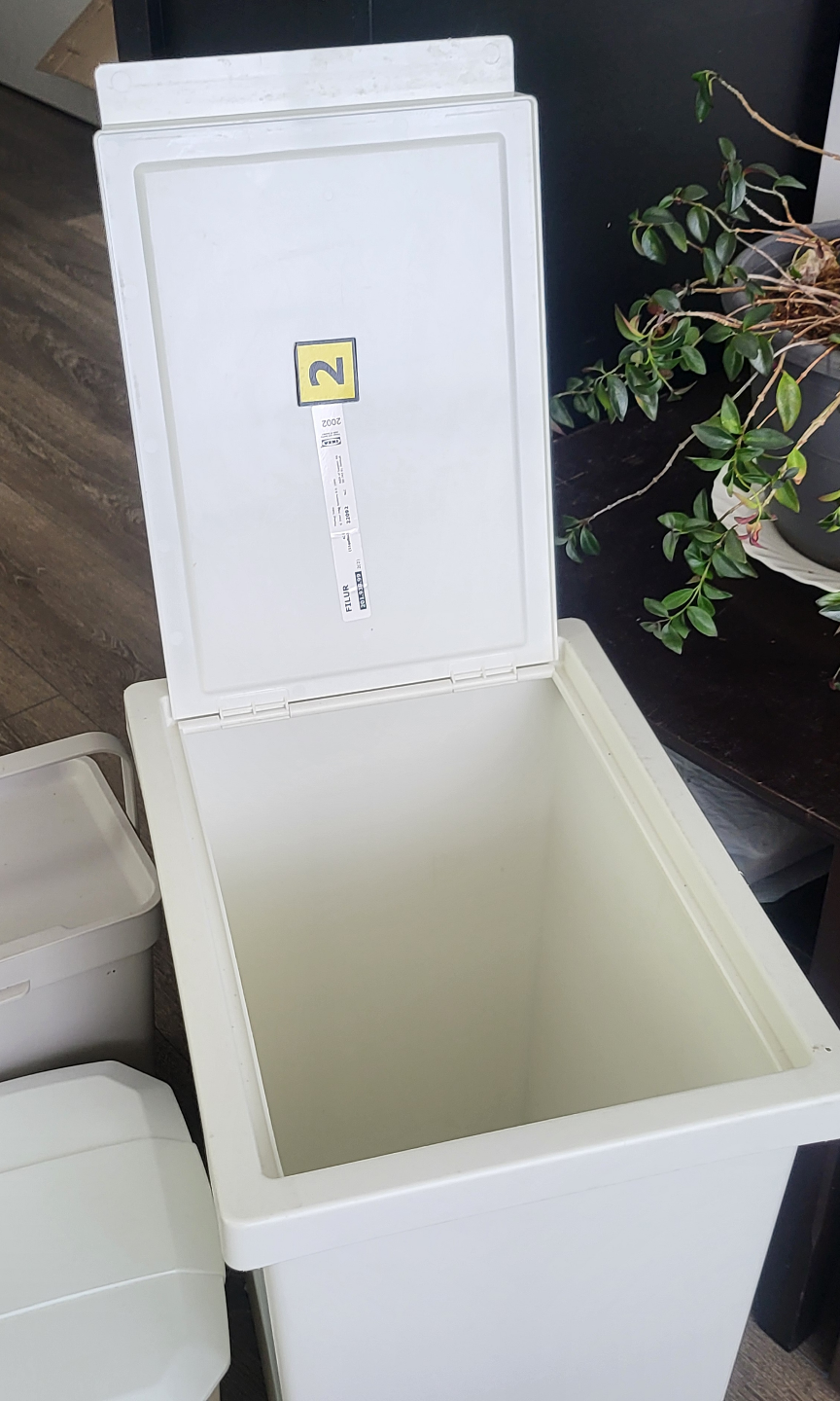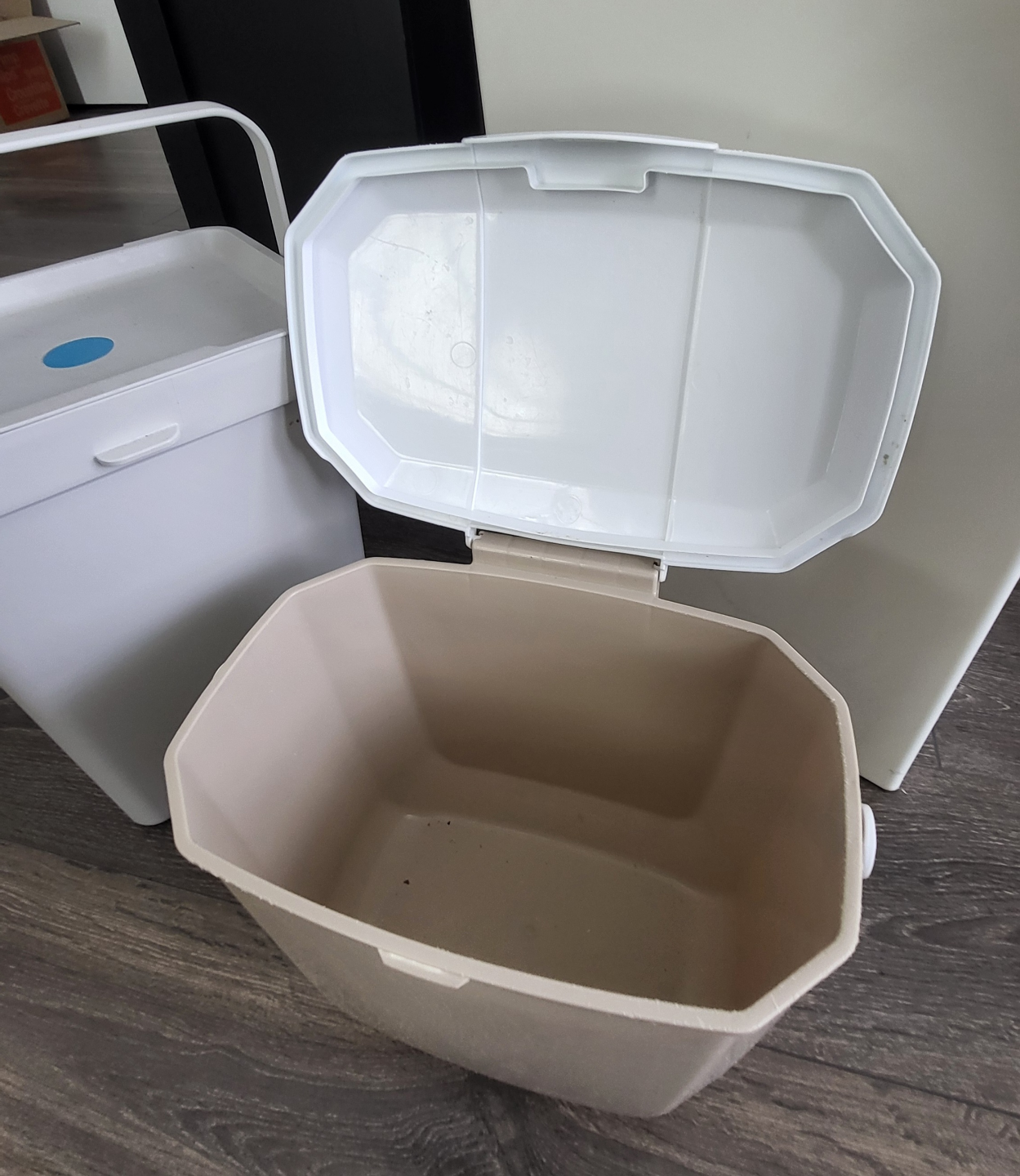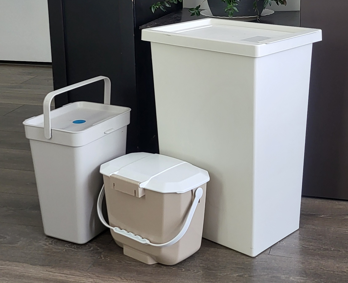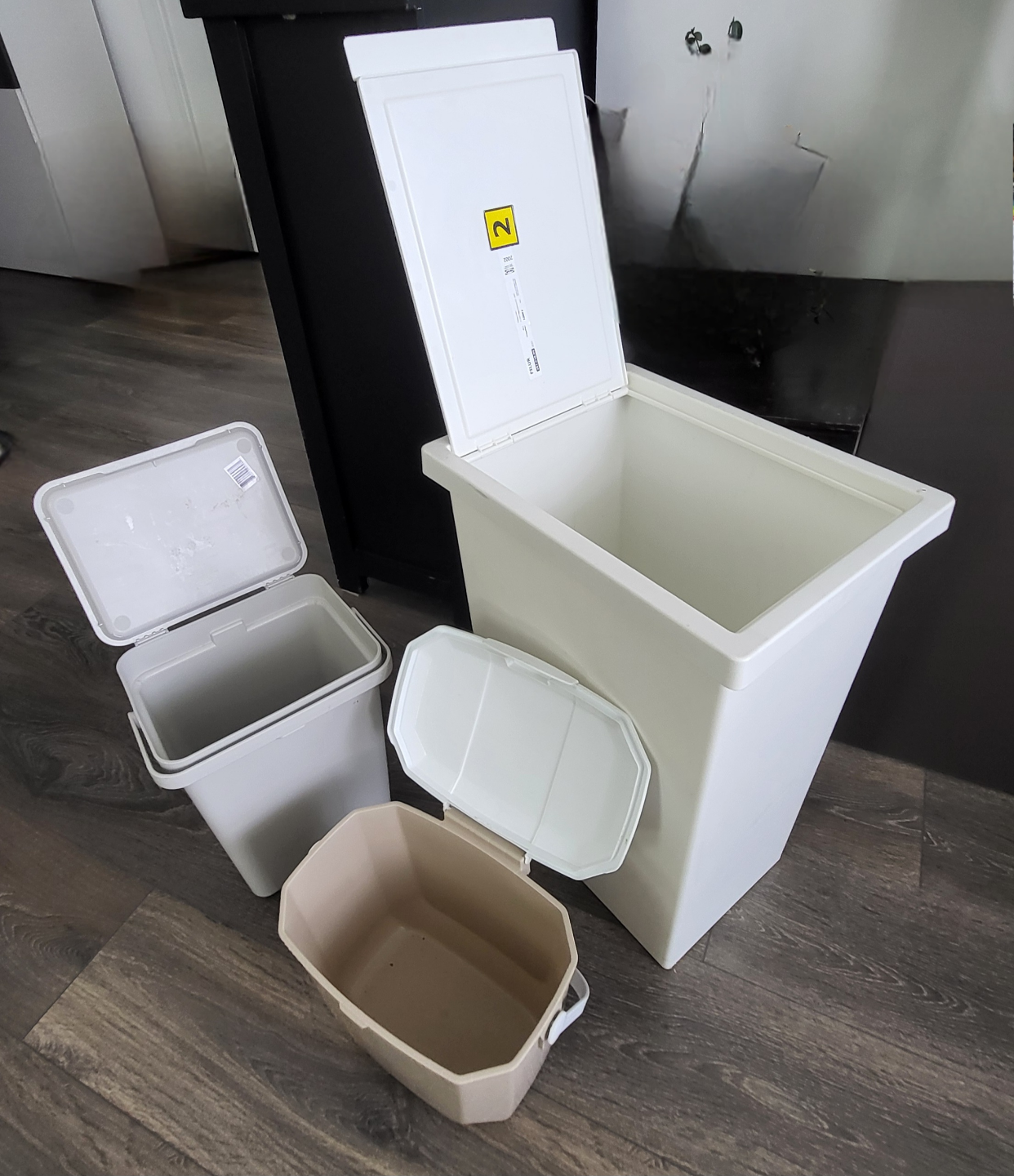 Three plastic bins, varying sizes and colours. Two off-white bins, one larger with a hinged lid and one smaller with a removable lid and carrying handle. One smaller beige bin with a removable lid and carrying handle. Great for organizing or waste disposal. IKIA