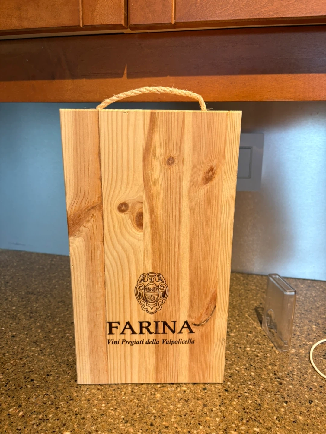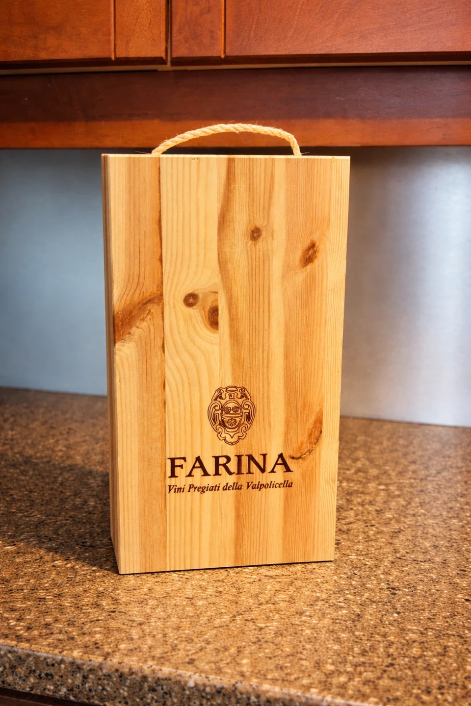 Beautiful solid wood wine box featuring Farina – Vini Pregiati della Valpolicella branding. This is a high-quality rustic piece with natural wood grain, knots, and rope handle for easy carrying.