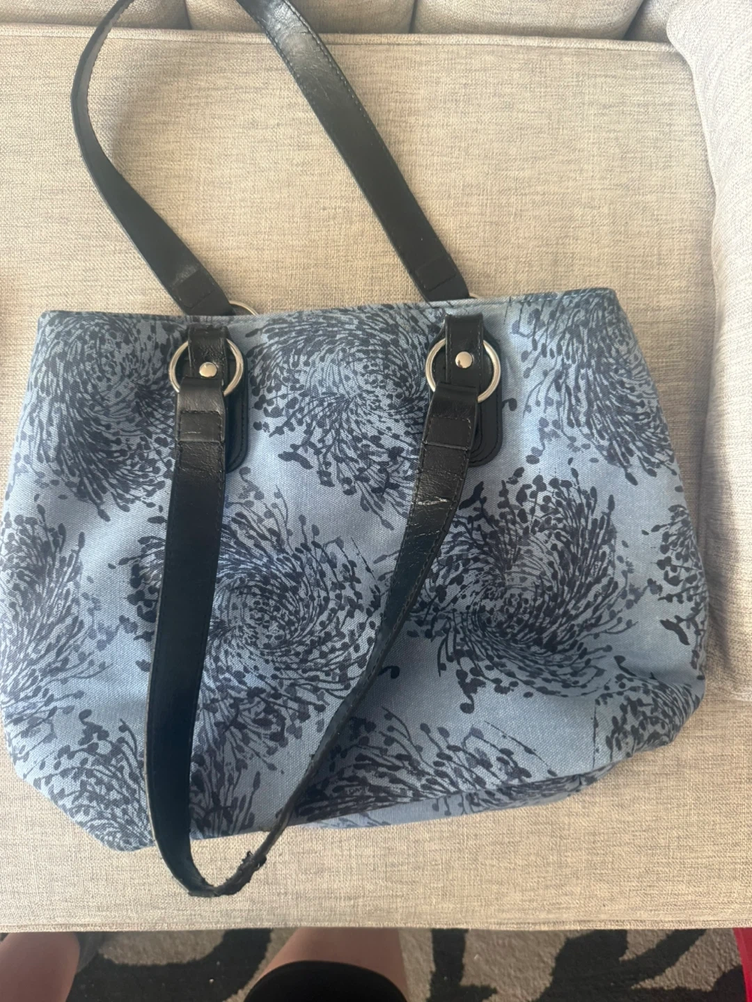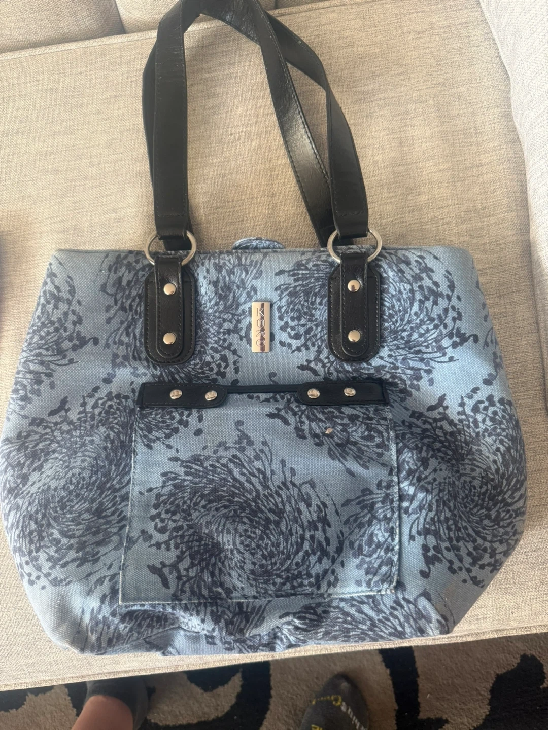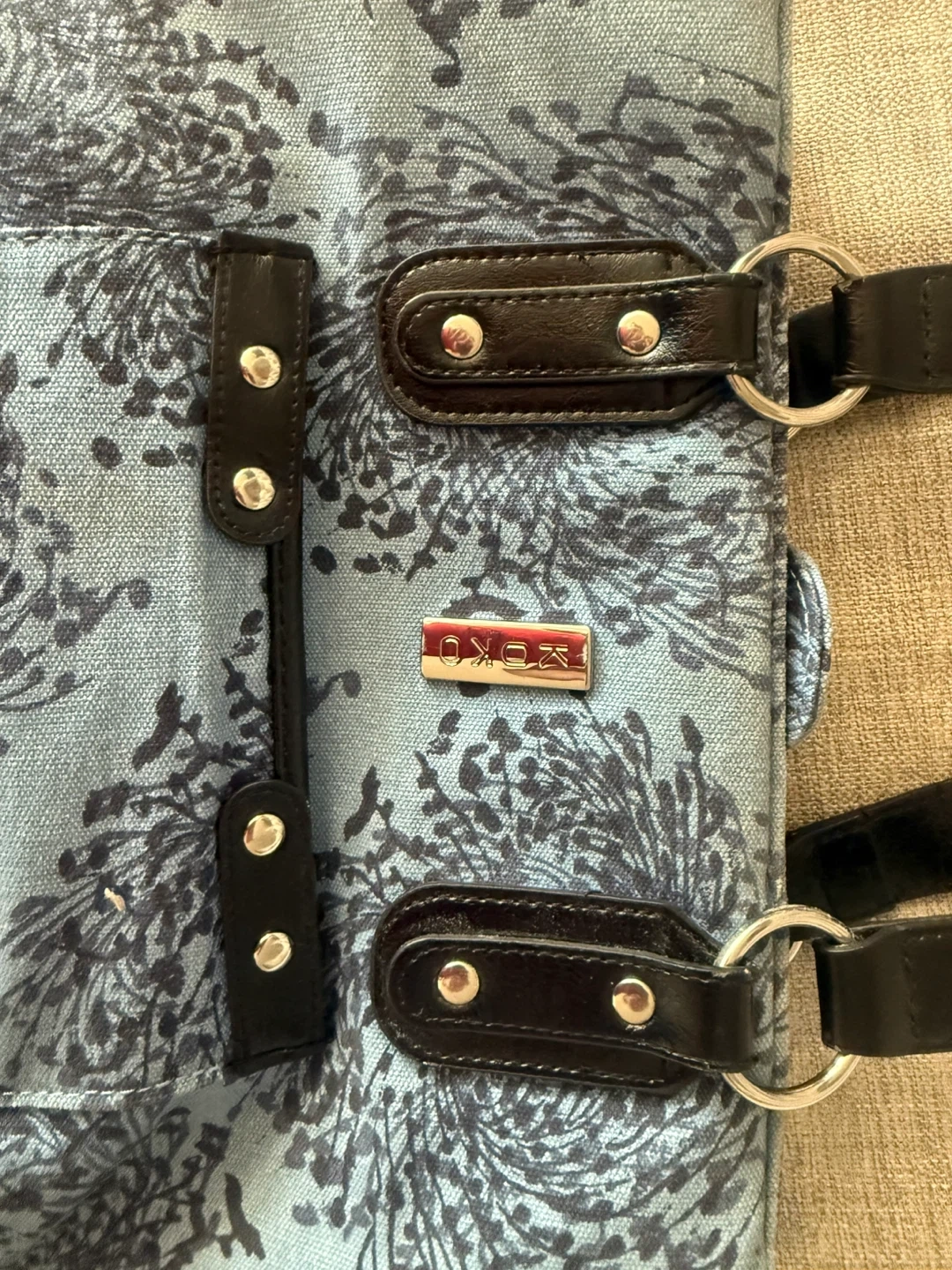 A cute OKOK tote bag with a unique floral pattern! It features black leather straps and silver hardware. Perfect for everyday use! This has a cooler bag side and a regular pouch as well