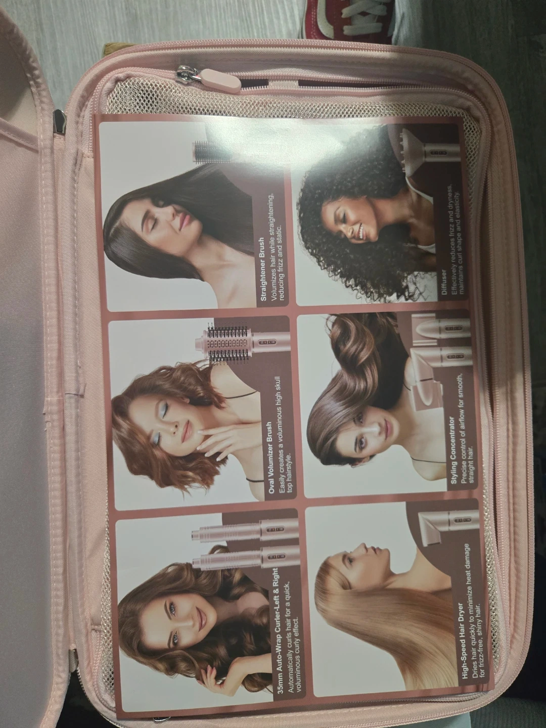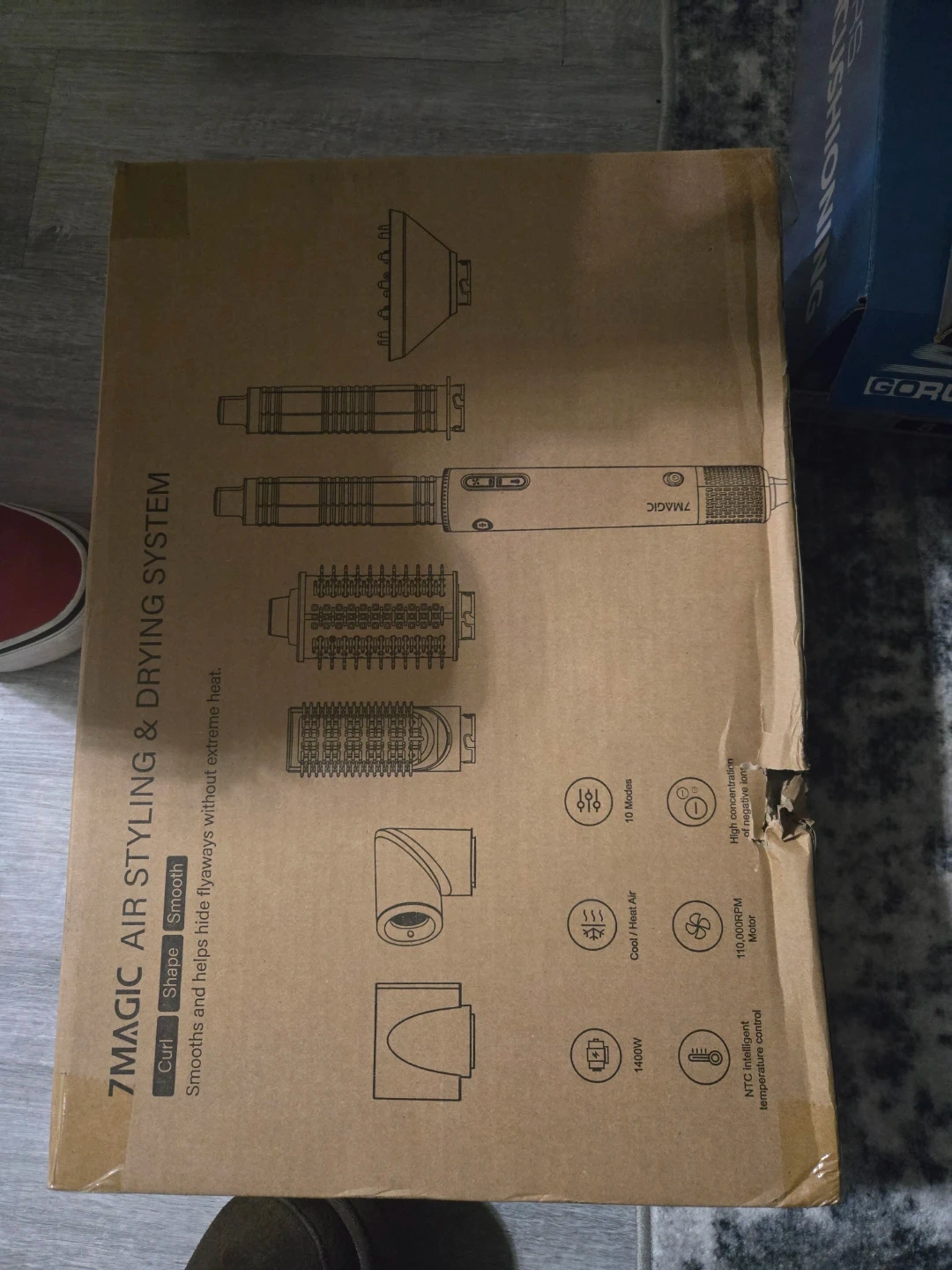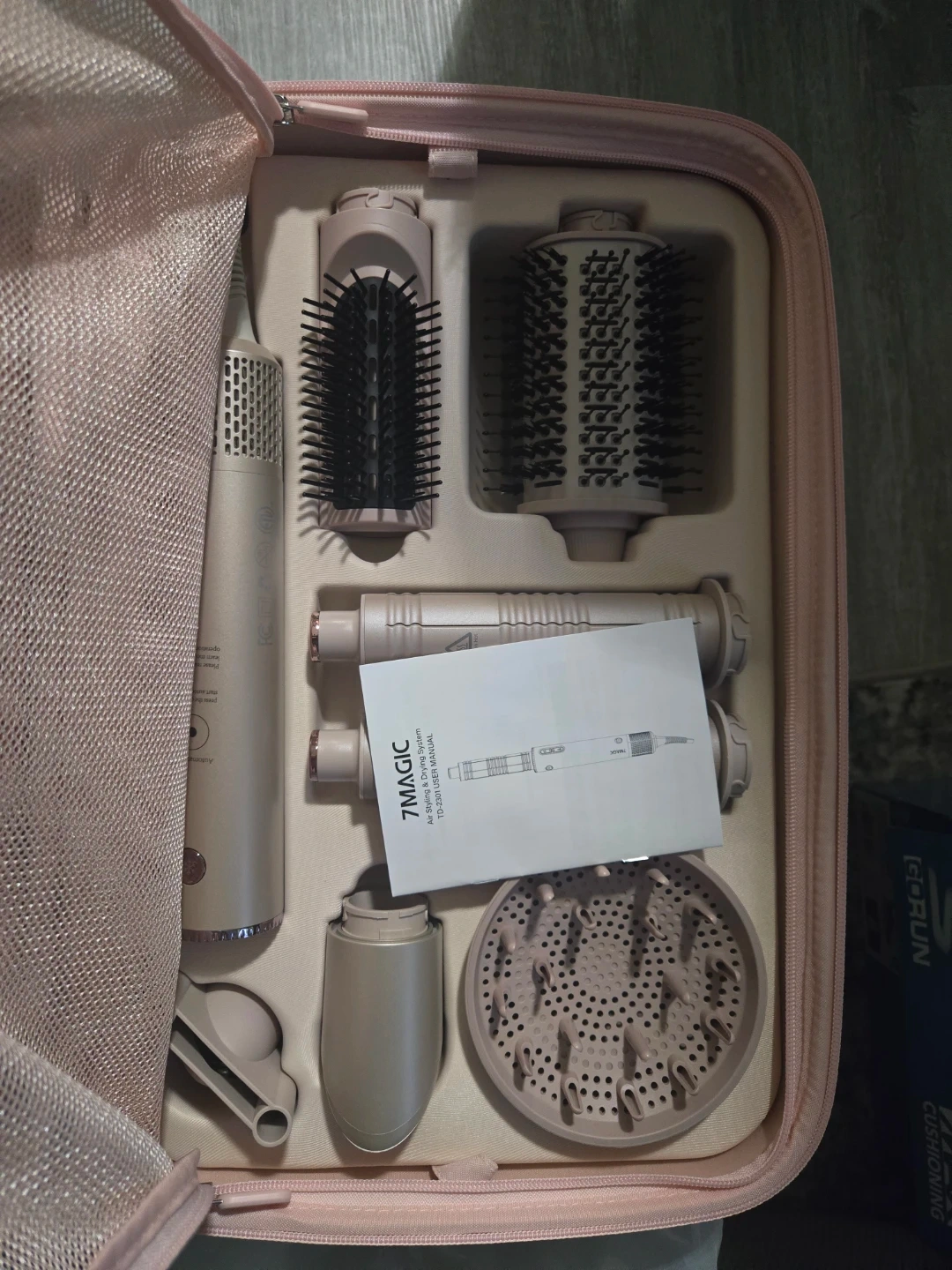7MAGIC 7-in-1 hair styling and drying system. Includes multiple styling attachments for curling, shaping, straightening, and diffusing. Features 110,000 RPM motor and NTC intelligent temperature control. Comes with a travel case.