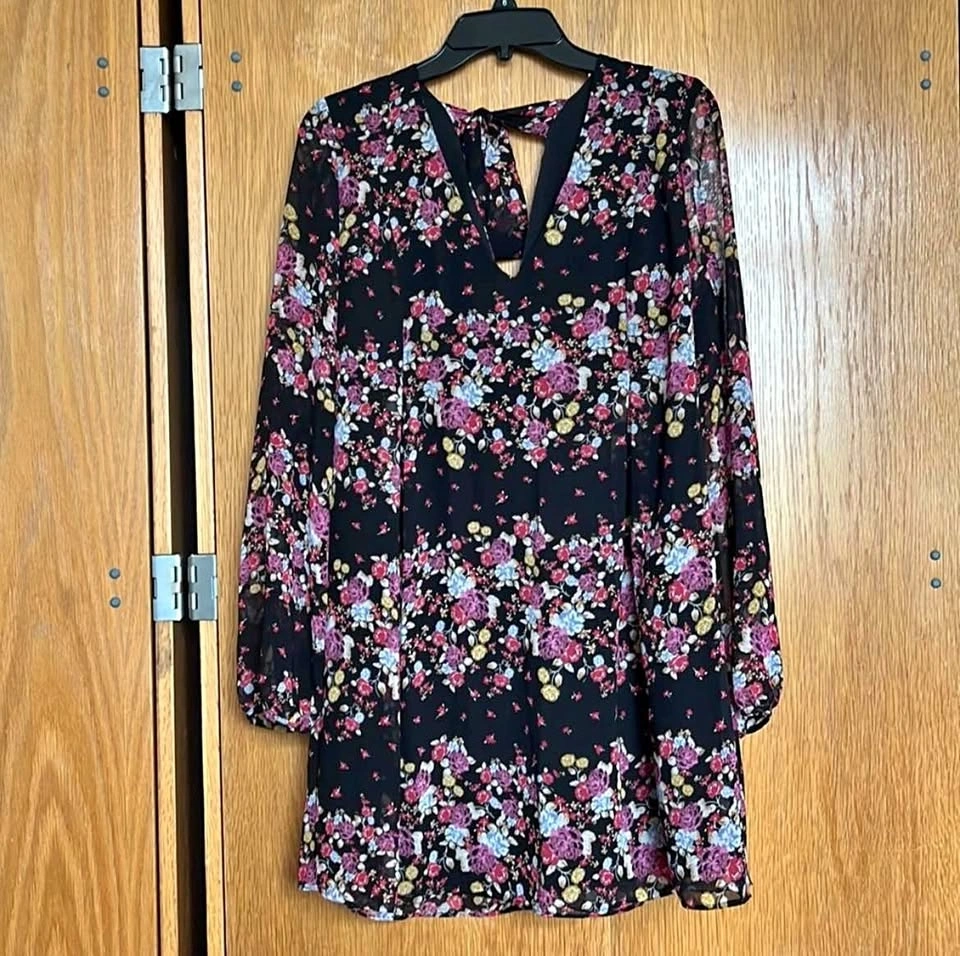 Beautiful chiffon dress from BCBGeneration. Perfect for the summer! Nice details - see through arms, v line back with the bow. Size L. Perfect condition!
