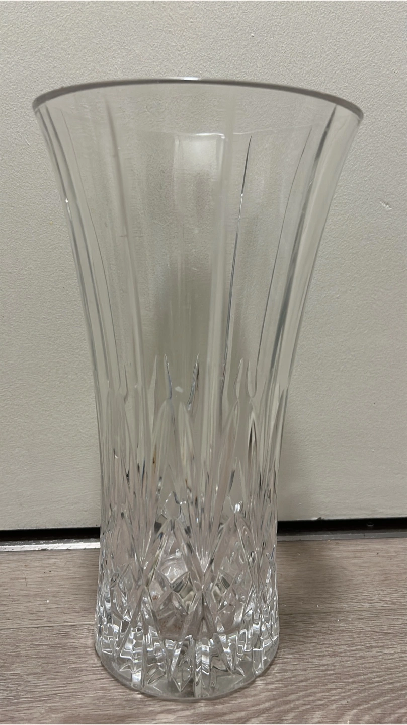 A beautiful clear crystal glass vase with a fluted design. It stands about 9 inches tall and would look lovely with fresh or artificial flowers.