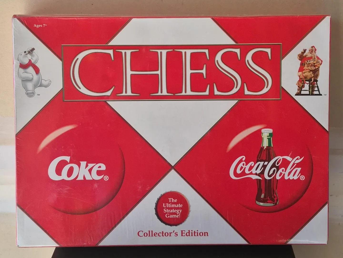 This is the Coca-Cola Collector's Edition Chess Game. It's a strategy board game for ages 7 and up. Includes the game board and pieces. Still sealed, never used.
