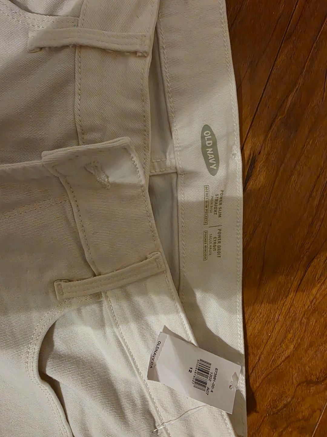 These are a pair of white Old Navy Power Slim Straight jeans in a size 12. They're brand new with tags and ready for a new home. The jeans are a stylish, comfortable fit perfect for spring and summer outfits.