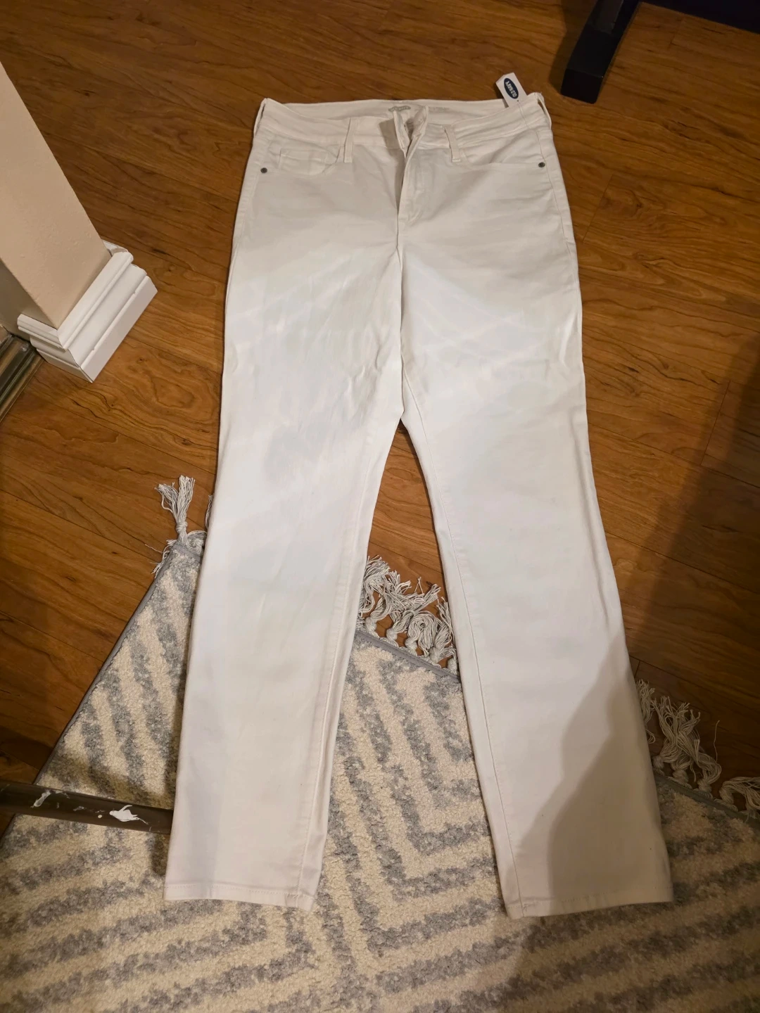 These are a pair of white Old Navy Power Slim Straight jeans in a size 12. They're brand new with tags and ready for a new home. The jeans are a stylish, comfortable fit perfect for spring and summer outfits.