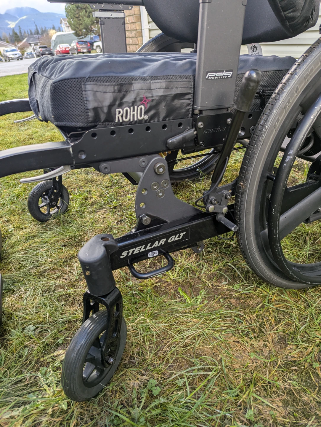 This PDG Mobility Stellar GLT tilt wheelchair features a Roho seat cushion for comfort. It was manufactured in 2022 and includes a seatbelt. This is a wheelchair that provides mobility assistance.The tilt function can go into a wide variety of positions, the push bar can be adjusted, plus the headrest and foot rests can all be adjusted to the correct fit. The leg rest is velcro and removable or can be moved up or down for preferred comfort.