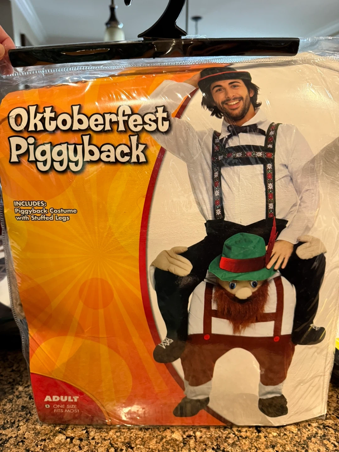 15Get ready for Oktoberfest with this fun piggyback costume! It includes the piggyback costume with stuffed legs. It's adult size, one size fits most.