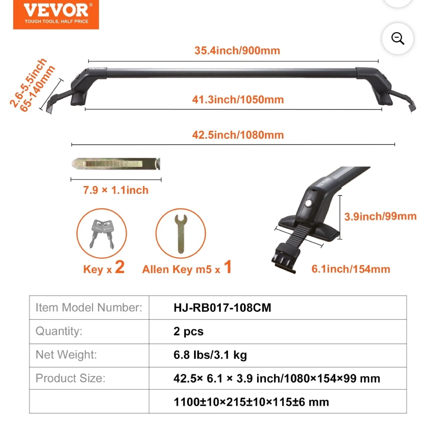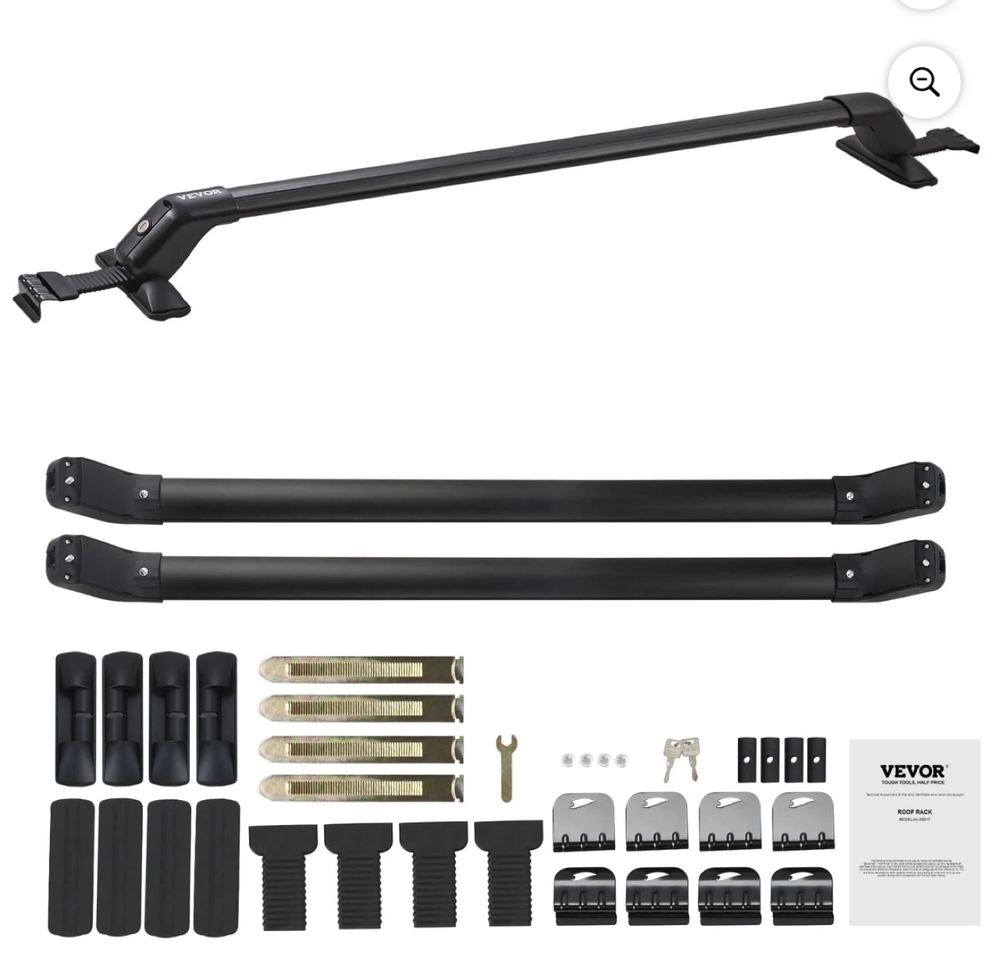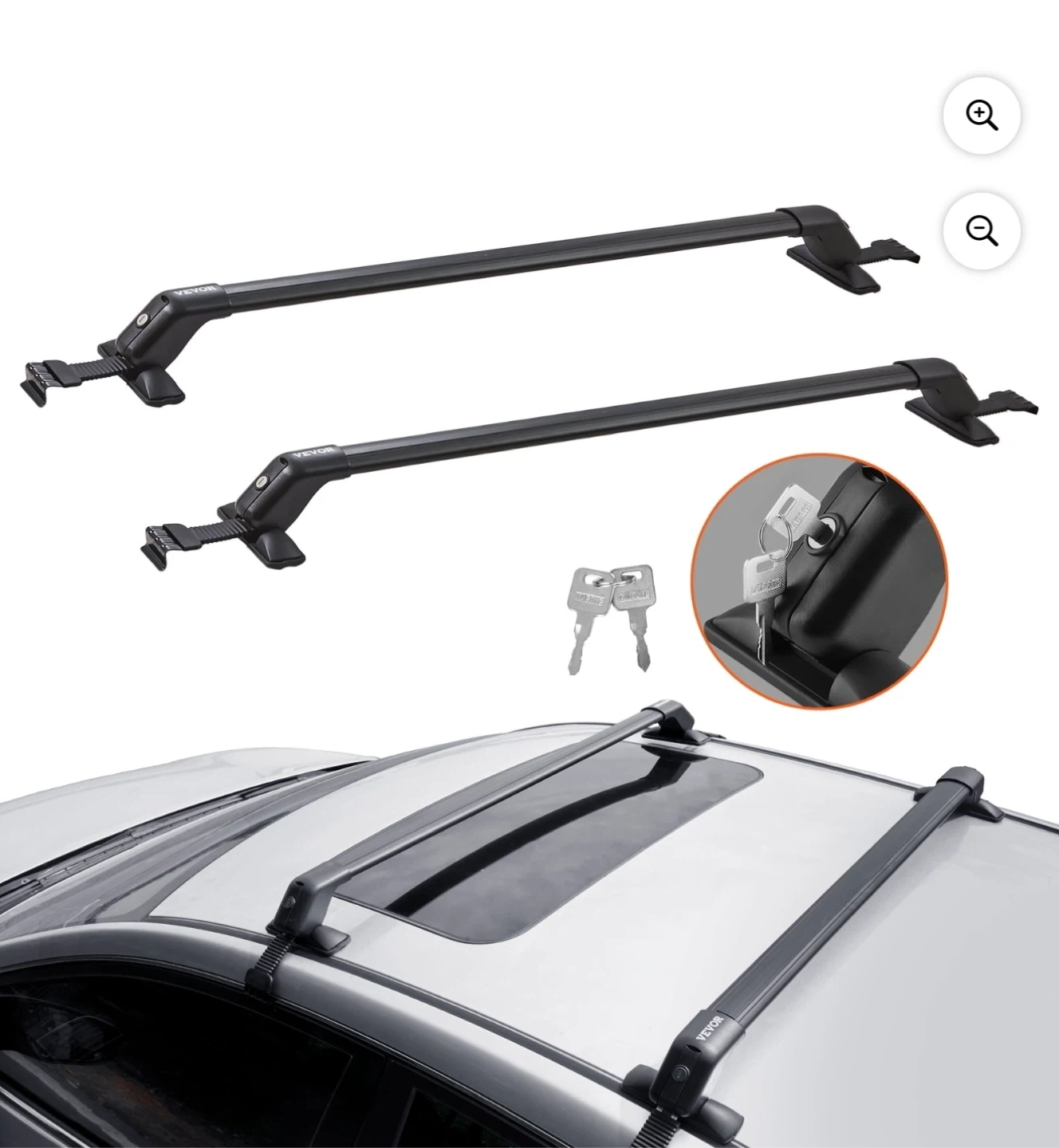 These VEVOR cross bars are made from aerospace-grade aluminum and PP mounting feet. They have a load capacity of 155 lbs and are designed for vehicles with a naked roof. Includes keys for locking mechanism.