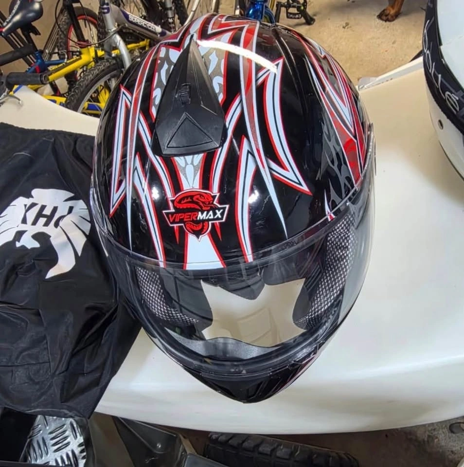 Up for grabs is a Vipermax Racing/Motocross helmet in good condition, perfect for the track or trail. It offers solid protection and a stylish look. Features include Snell and DOT approval, aerodynamic design, a padded interior for comfort, adjustable ventilation, and lightweight construction. This helmet has been cleaned and disinfected and comes with a carrying and storage bag. Asking $100.