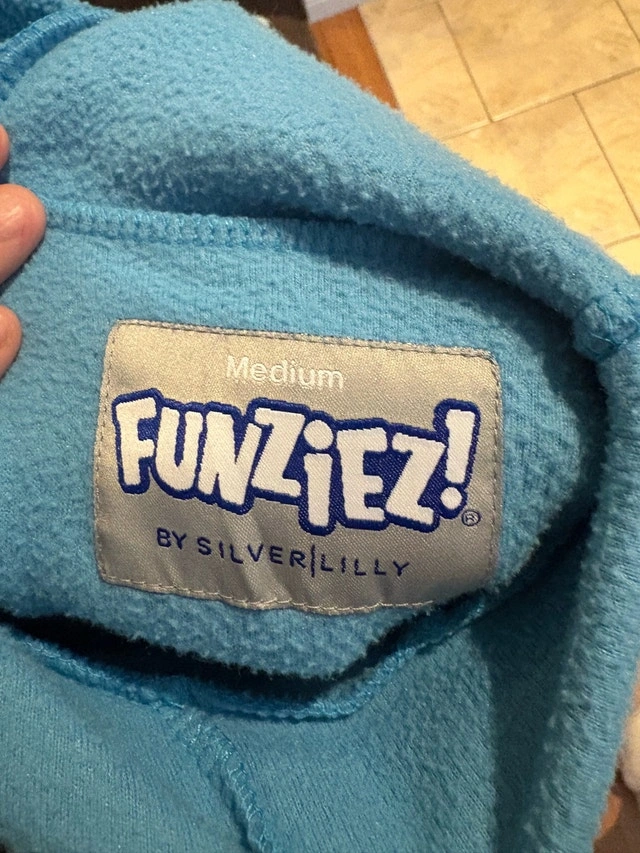 This cozy, medium-sized onesie features a full zip-up front, a comfy hood with googly eyes, and a playful array of plush tentacles that are sure to turn heads. It's in great condition and ready for its next adventure, whether it's a costume party, a cozy night in, or just some silly fun. Specifications: Brand: Funziez by Silver Lilly Size: Medium Material: Plush, soft fabric Features: Hood with eyes, full zip, attached tentacles Perfect for children or adults!