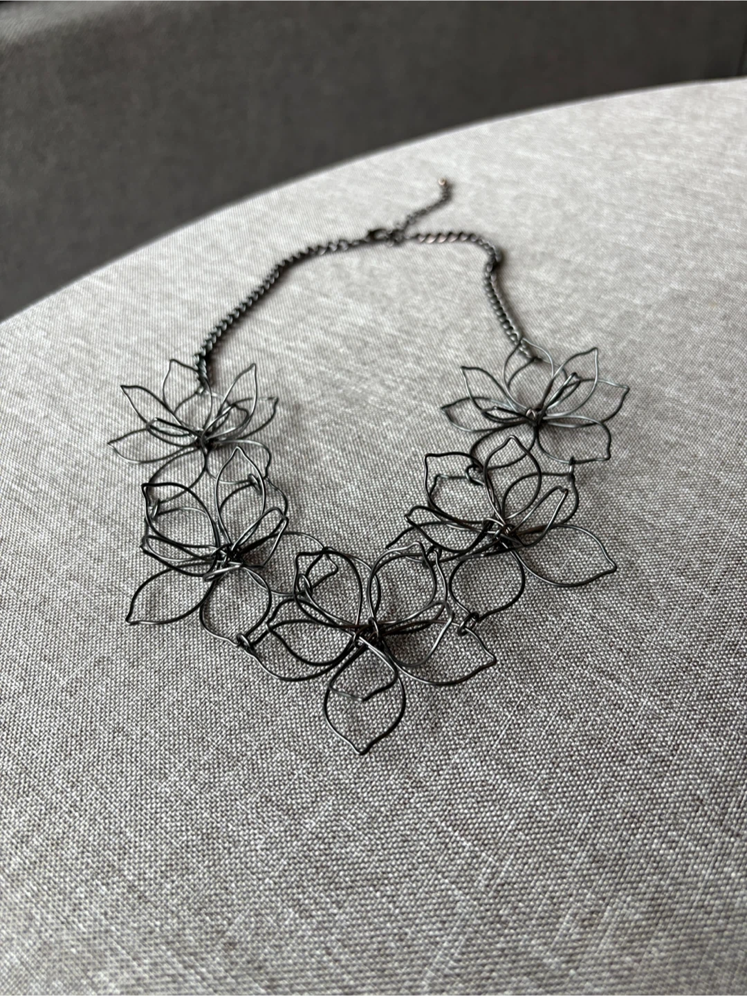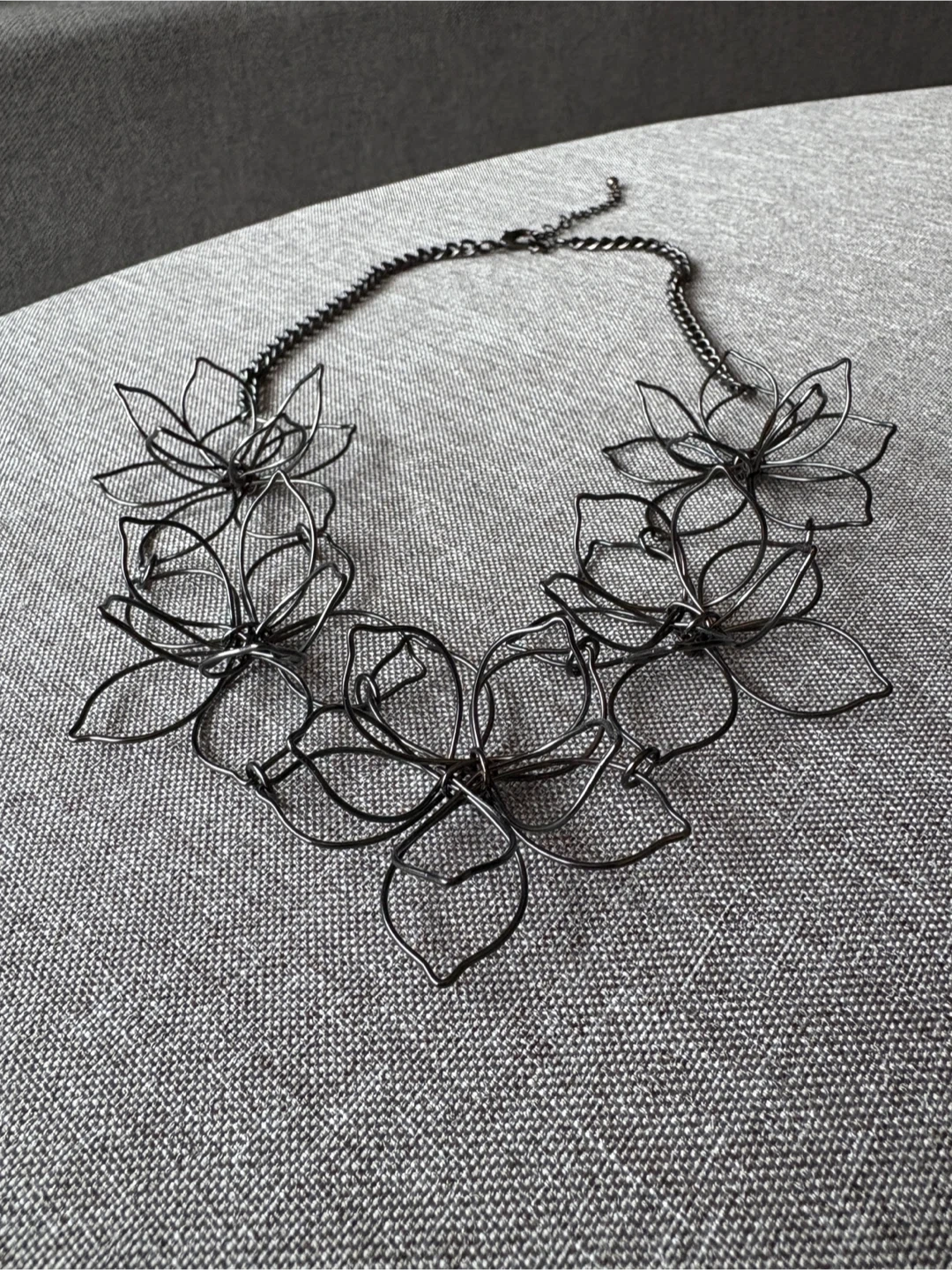 Selling a flower statement necklace. It's a unique piece that will add a touch of elegance to any outfit. The necklace features a series of delicate wire flowers connected by a chain. It's in great condition and ready to be worn!