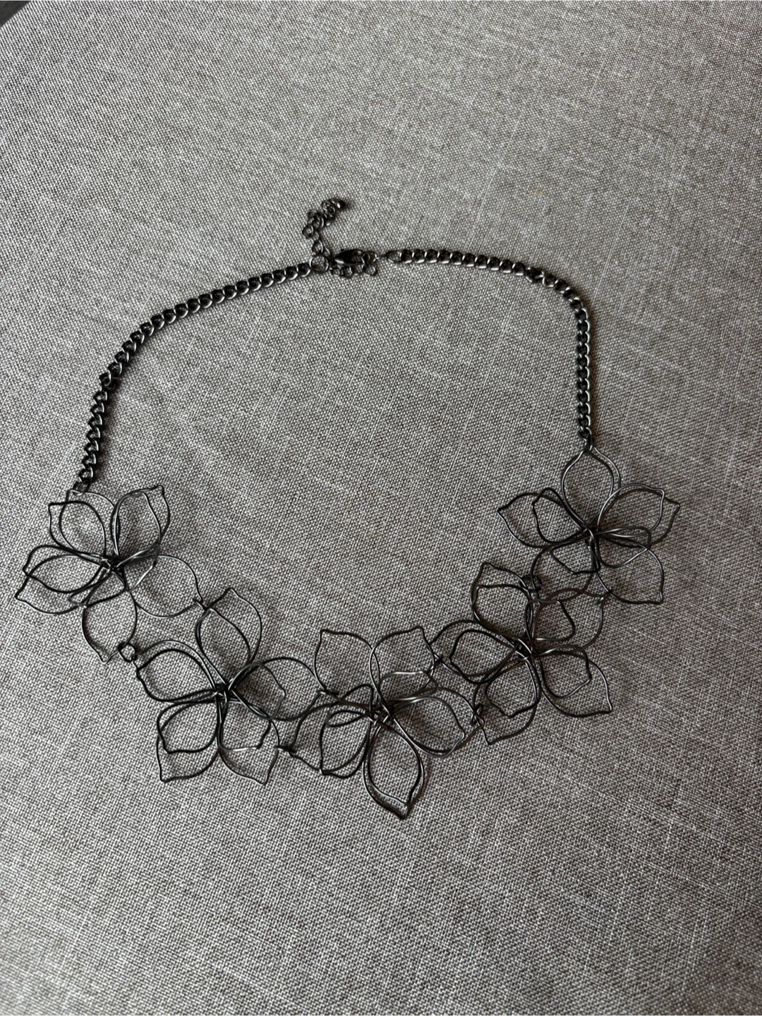 Selling a flower statement necklace. It's a unique piece that will add a touch of elegance to any outfit. The necklace features a series of delicate wire flowers connected by a chain. It's in great condition and ready to be worn!