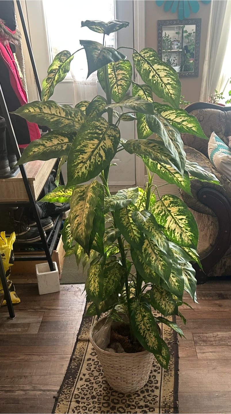 This is a large artificial Dieffenbachia plant, also known as Dumb Cane. It features beautiful green and white variegated leaves. It's potted in a decorative woven basket. It's a great addition to any indoor space!