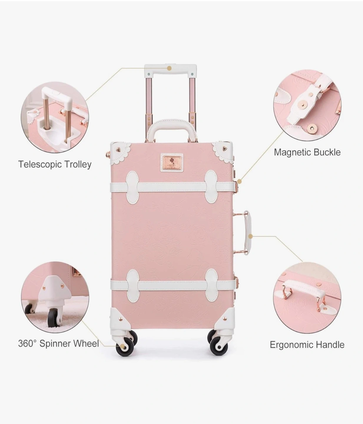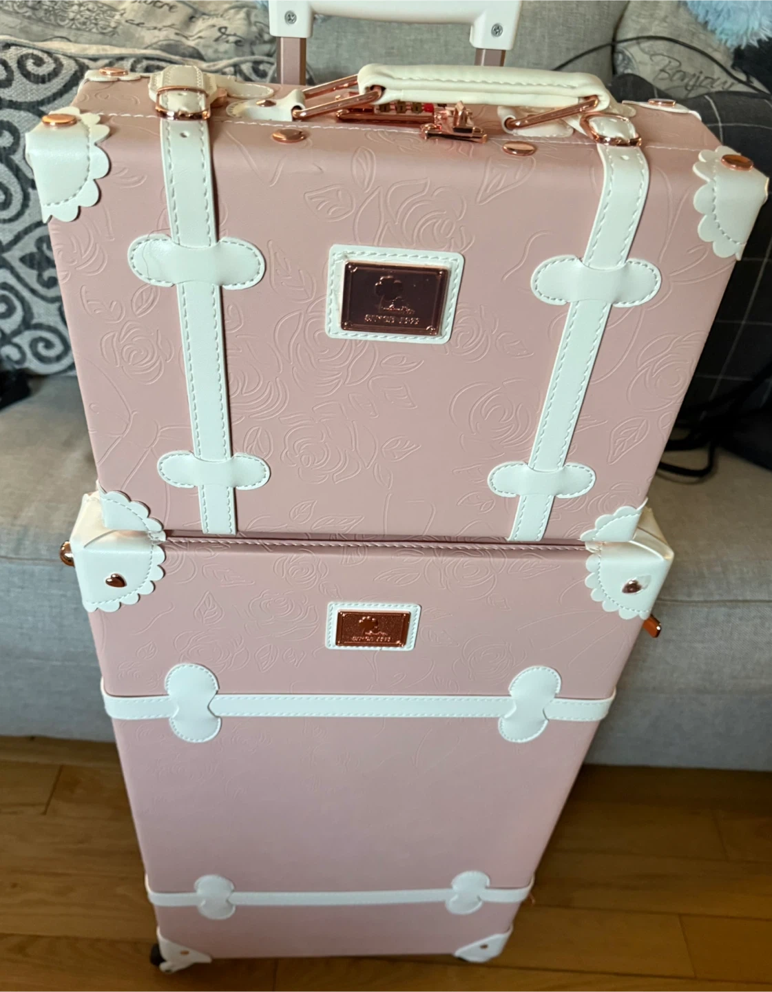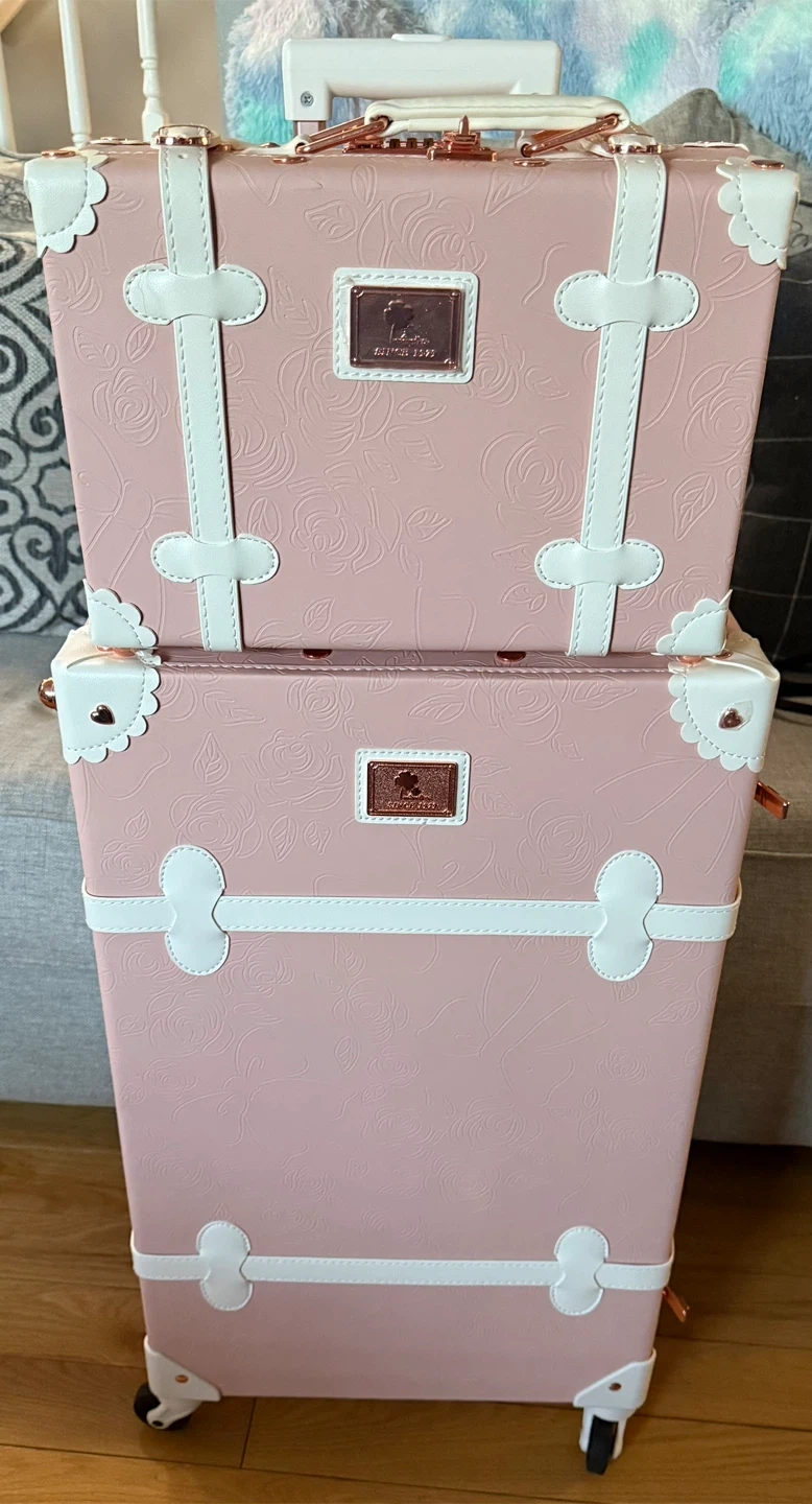 This set includes a larger suitcase and a smaller carry-on, both in a charming pink embossed rose pattern with white trim. They feature a telescopic trolley, 360 spinner wheels, and magnetic buckles for easy closure. The interior is lined and includes organizational pouches.