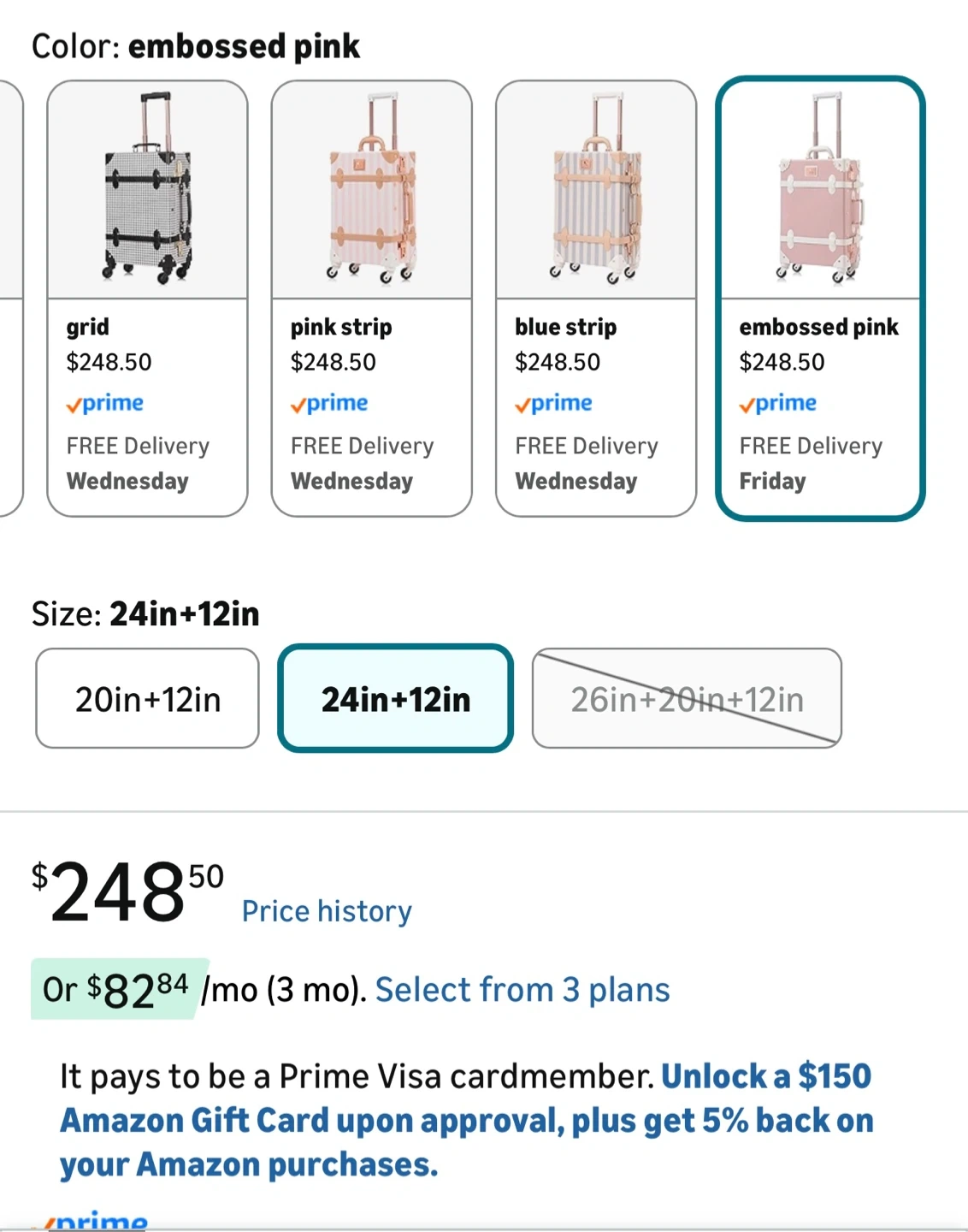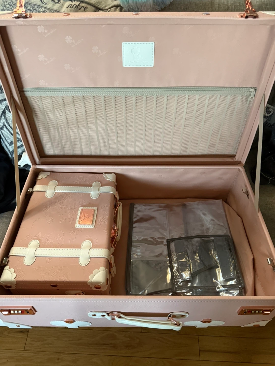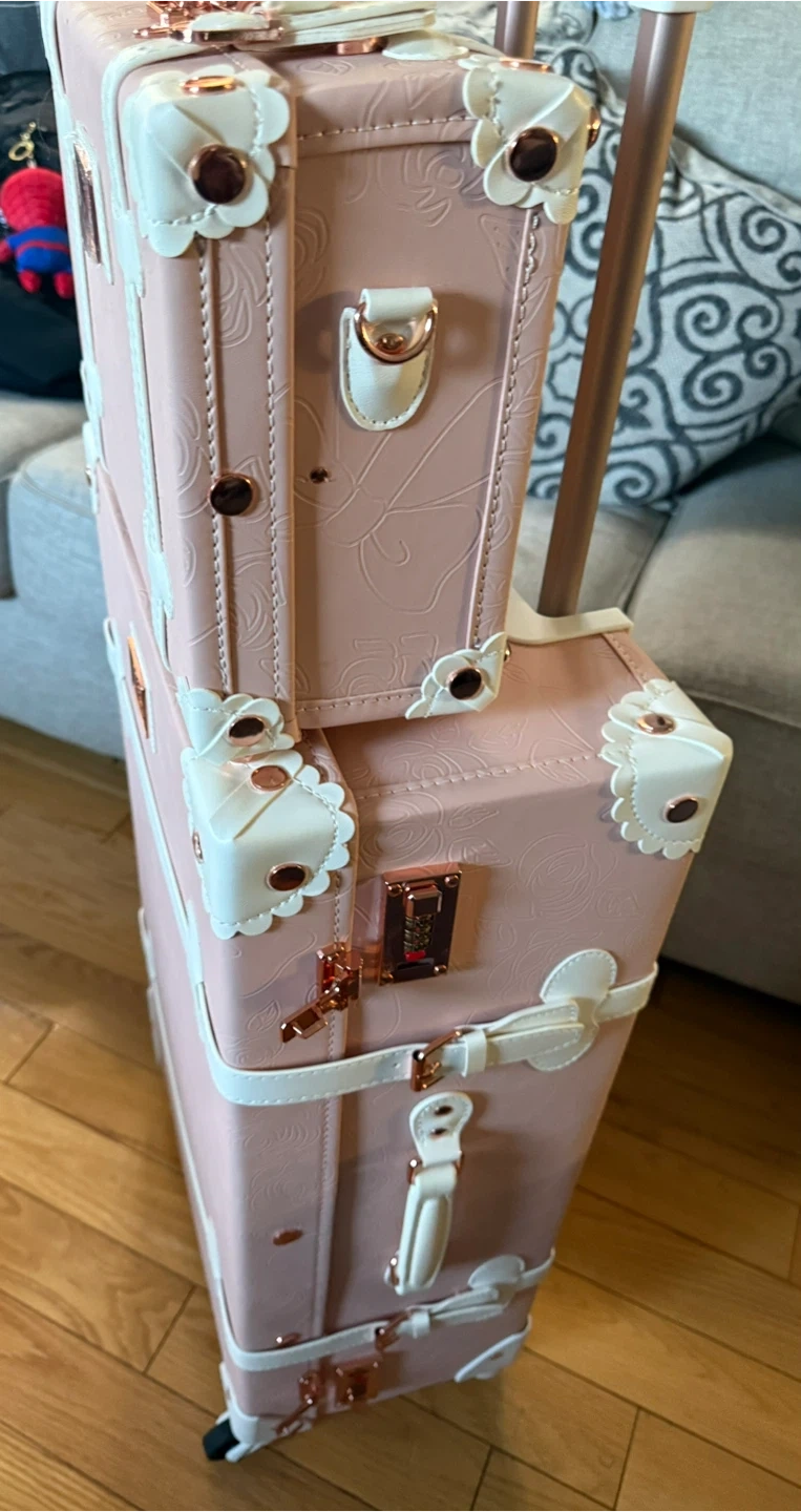 This set includes a larger suitcase and a smaller carry-on, both in a charming pink embossed rose pattern with white trim. They feature a telescopic trolley, 360 spinner wheels, and magnetic buckles for easy closure. The interior is lined and includes organizational pouches.