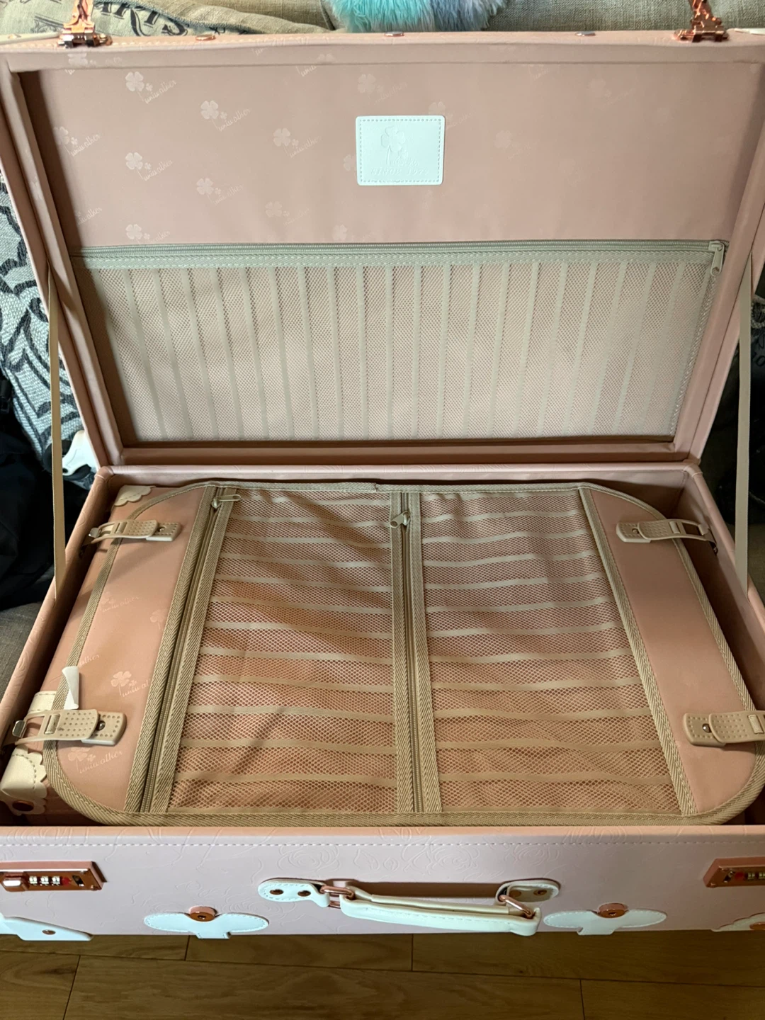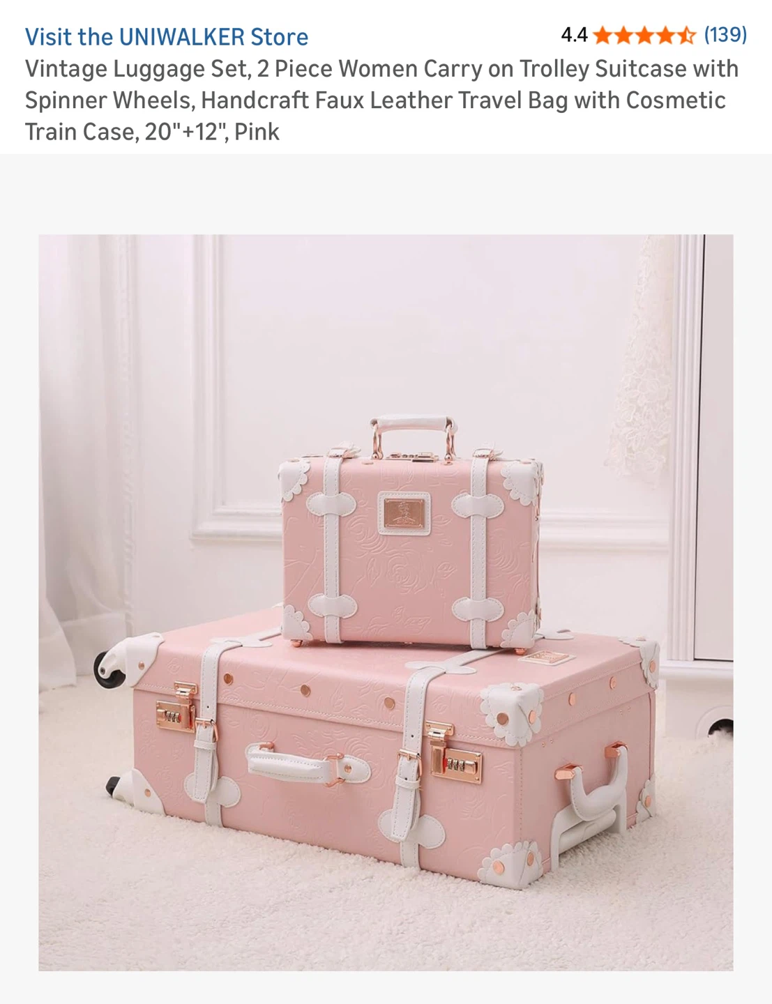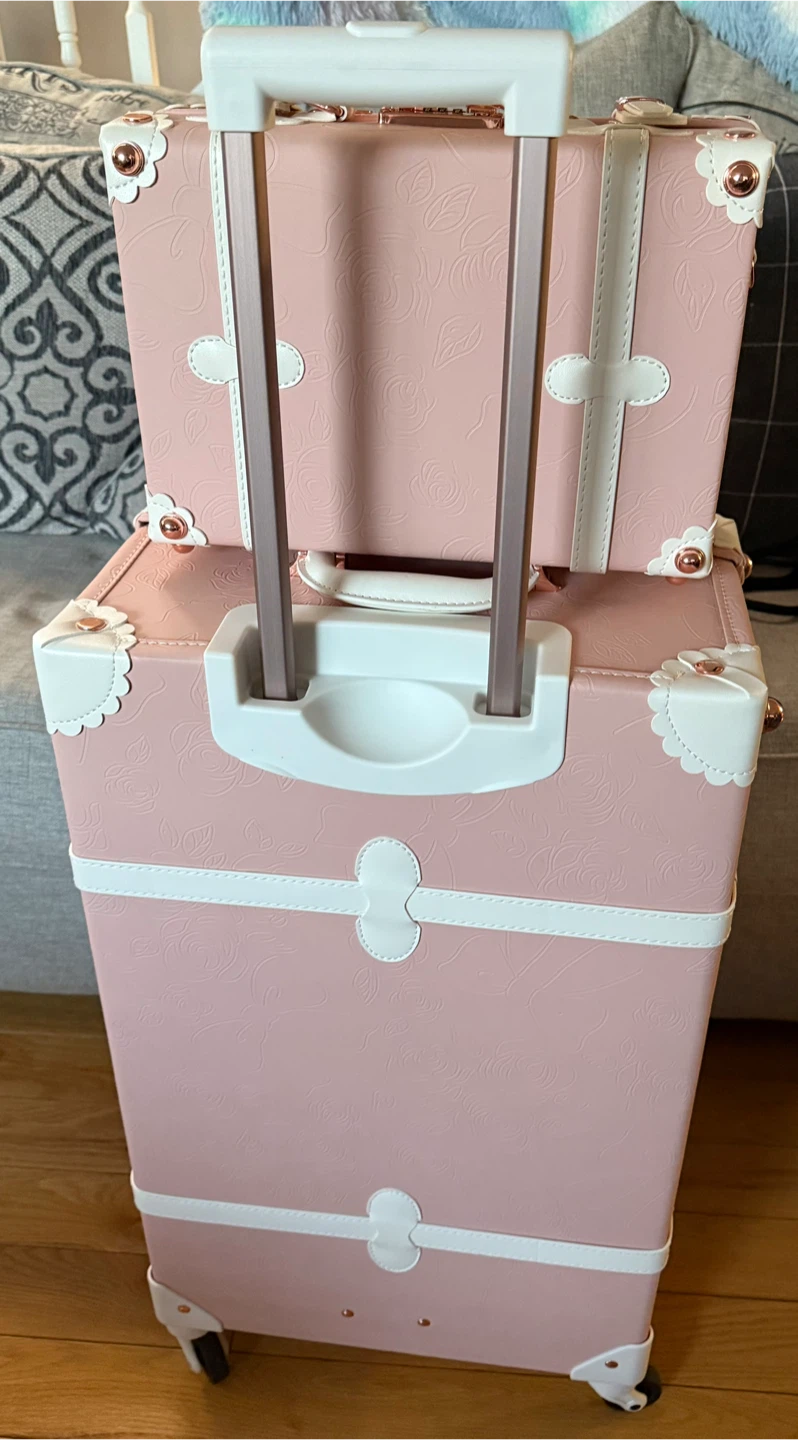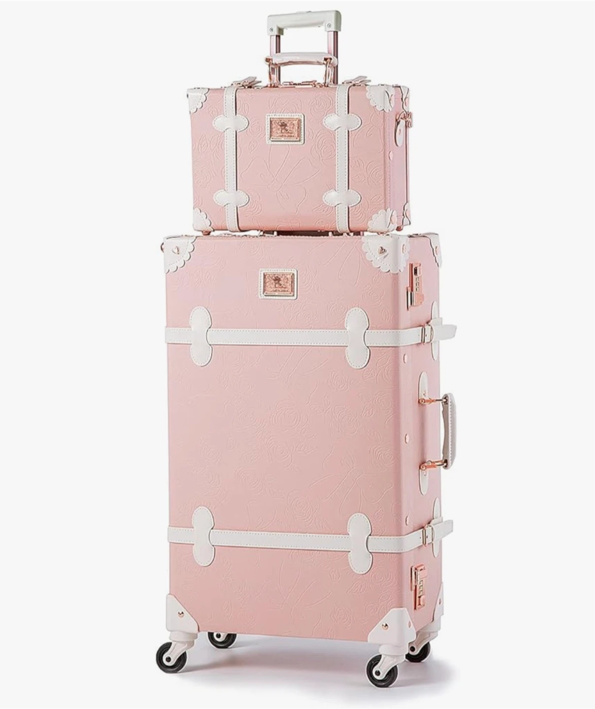 This set includes a larger suitcase and a smaller carry-on, both in a charming pink embossed rose pattern with white trim. They feature a telescopic trolley, 360 spinner wheels, and magnetic buckles for easy closure. The interior is lined and includes organizational pouches.