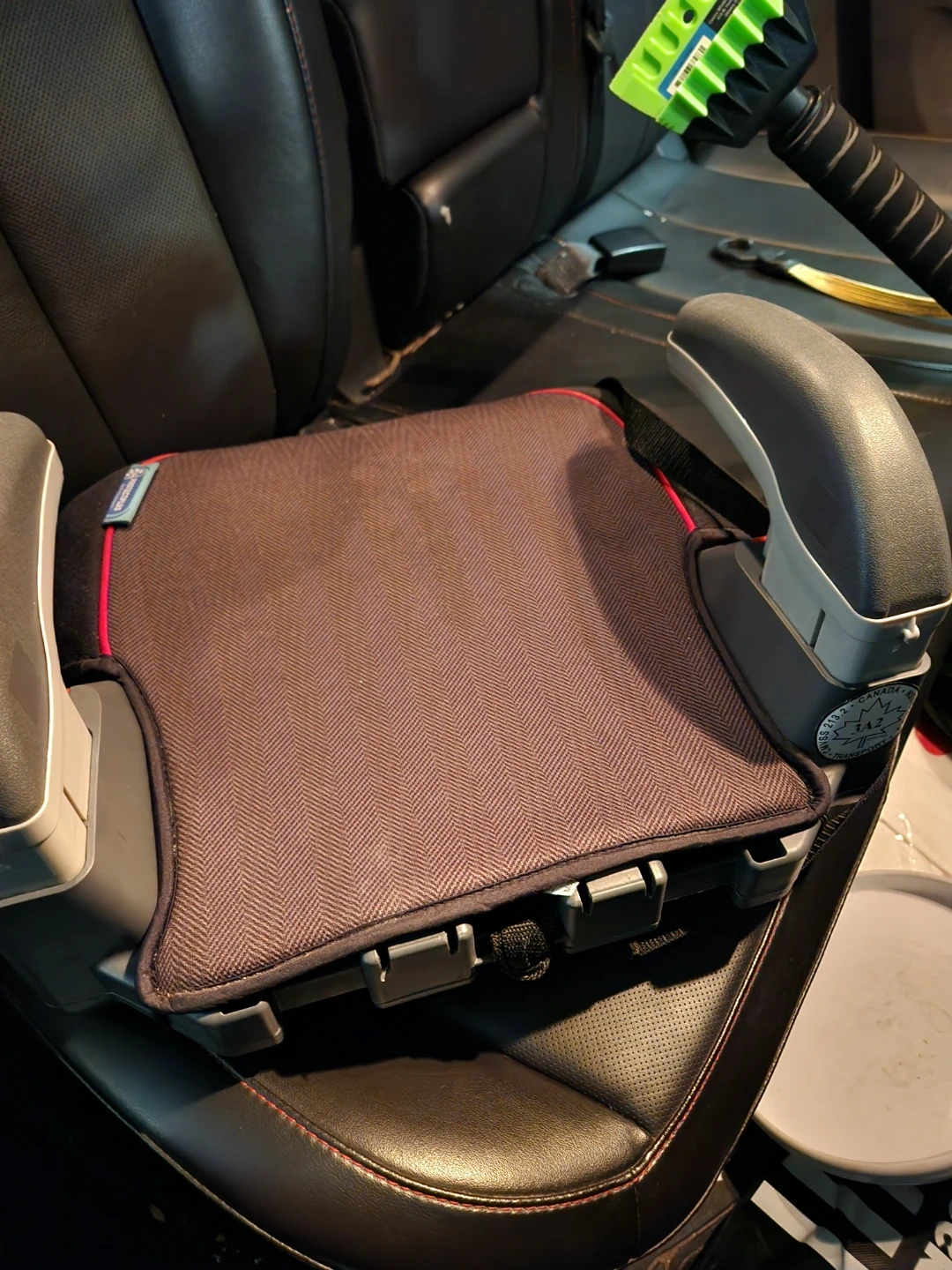 This is a Graco booster car seat in dark grey with red trim. It's designed for growing kids needing a little extra height for seat belts.