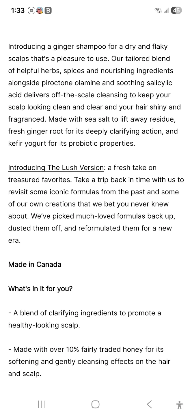 Introducing Lush Ginger shampoo for a dry and flaky scalp. It's made with over 10% fairly traded honey for softening and gently cleansing effects on hair and scalp. This shampoo offers off-the-scale cleansing to keep your scalp looking clean and your hair shiny and fragranced. It's a fresh take on treasured favourites, revisiting iconic formulas from the past.