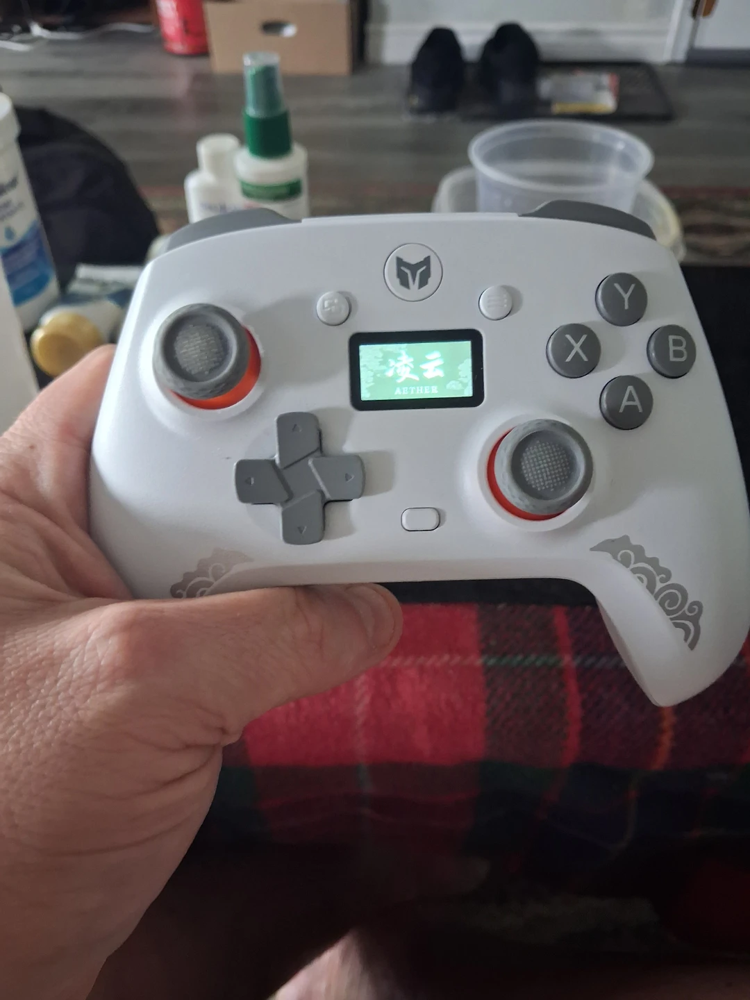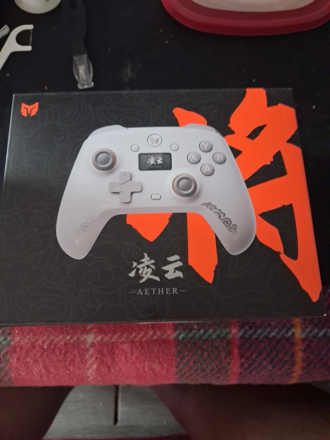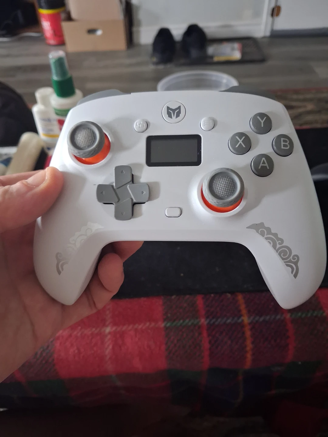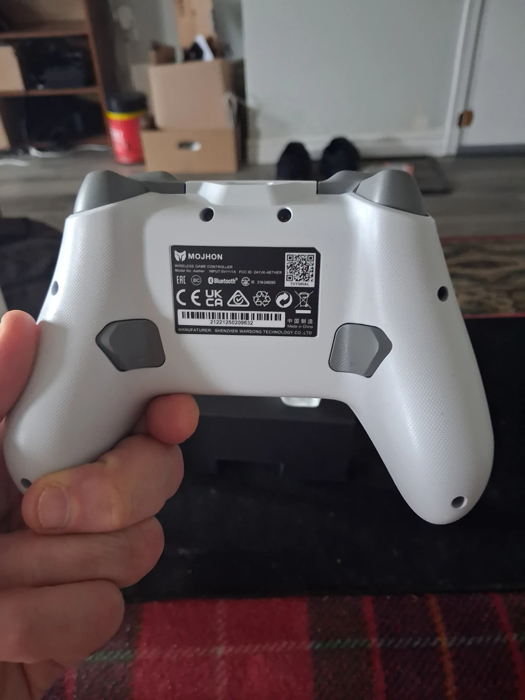 This is a white Mojon Aether wireless game controller. It features a small LCD screen for in-game information. Includes original box.
