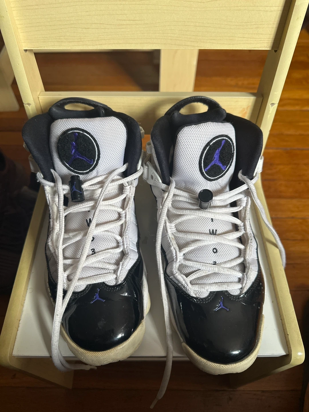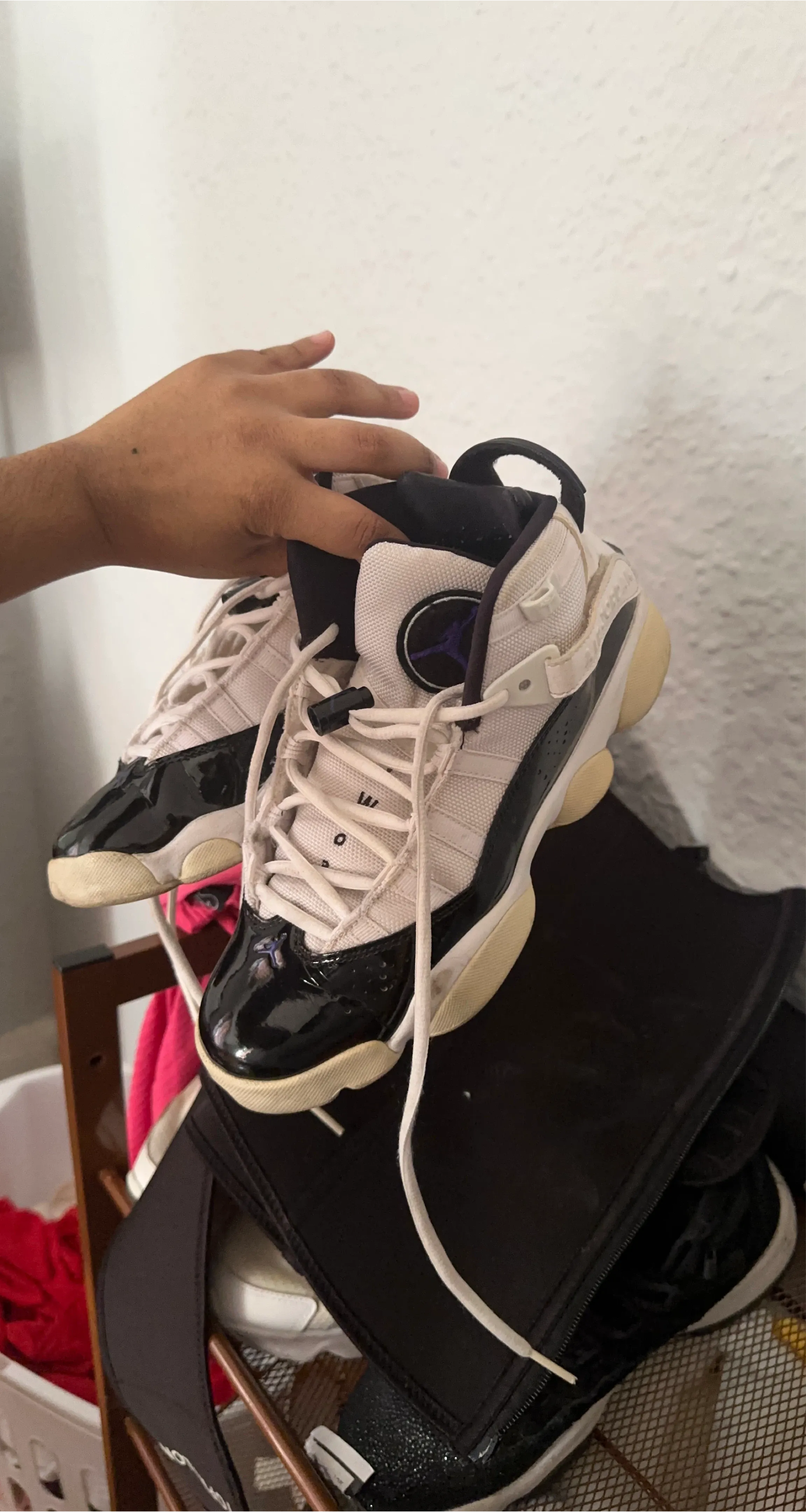 Jordan 6 Rings men's basketball shoes. Features a mix of white, black, and purple. Iconic design with visible Air cushioning. Lace-up closure for a secure fit.