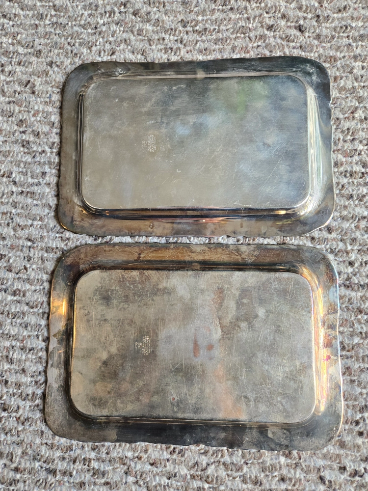 Selling two silver-plated trays marked "Old English Reproduction E.P. on Copper".