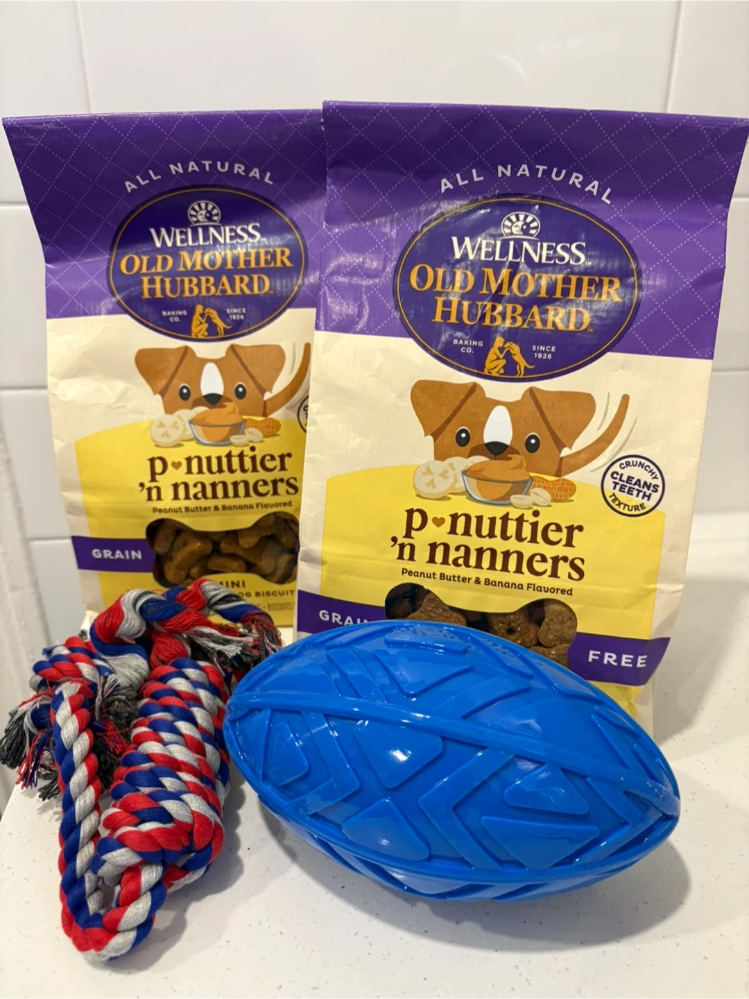 472 bags - Old Mother Hubbard P-Nuttier small dog treats! They're peanut butter and banana flavoured and help clean your pup's teeth. Perfect for small dogs! Two dog toys - new!